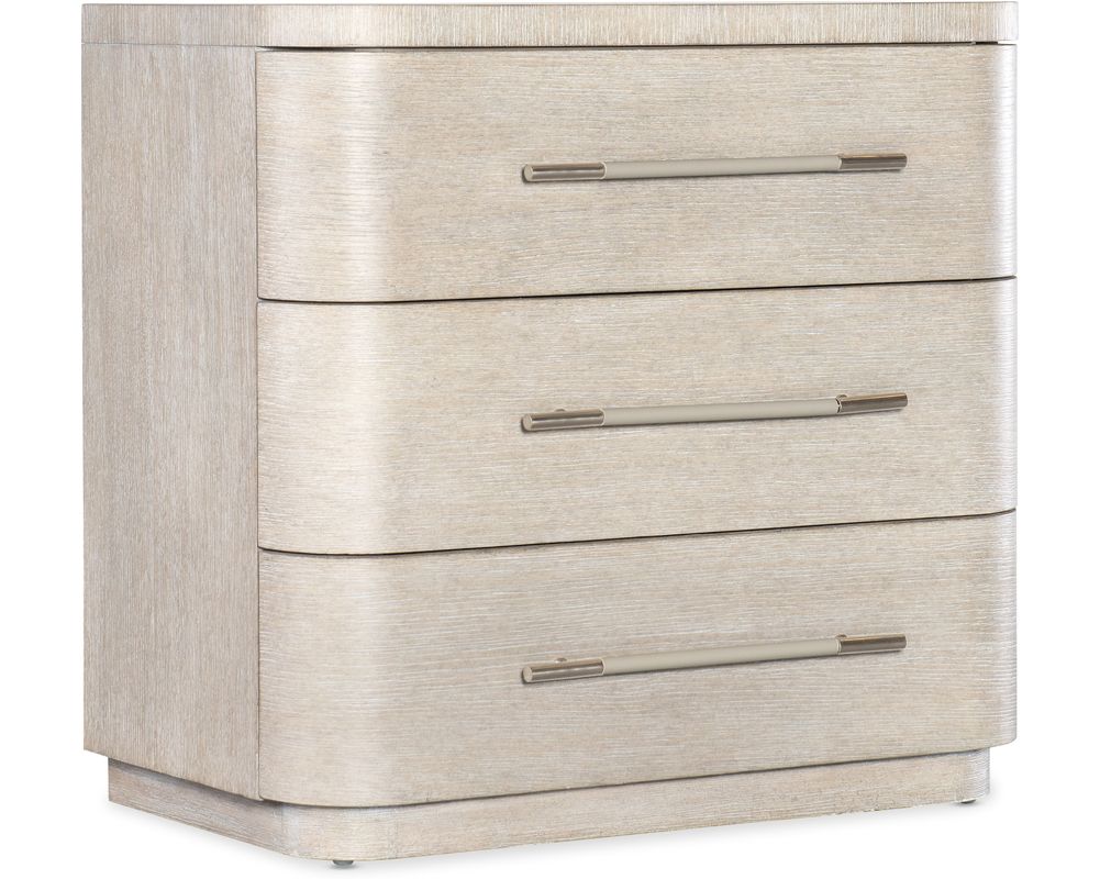 From Sofas and Sectionals.com: Introducing the Modern Mood Three-Drawer Nightstand, a stunning addition to any bedroom. This nightstand boasts a clean and modern profile, with rounded corners and a plinth base for elegance. Its luxurious materials, including Oak Veneers and a serene Diamond finish, make it a standout statement piece in any room.