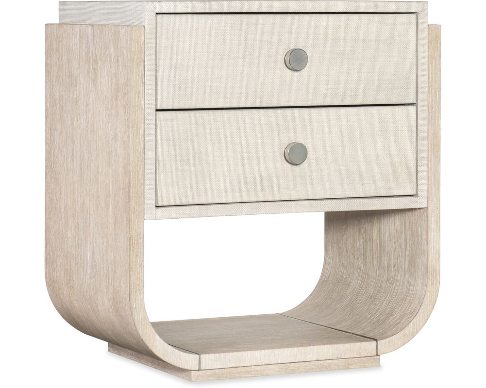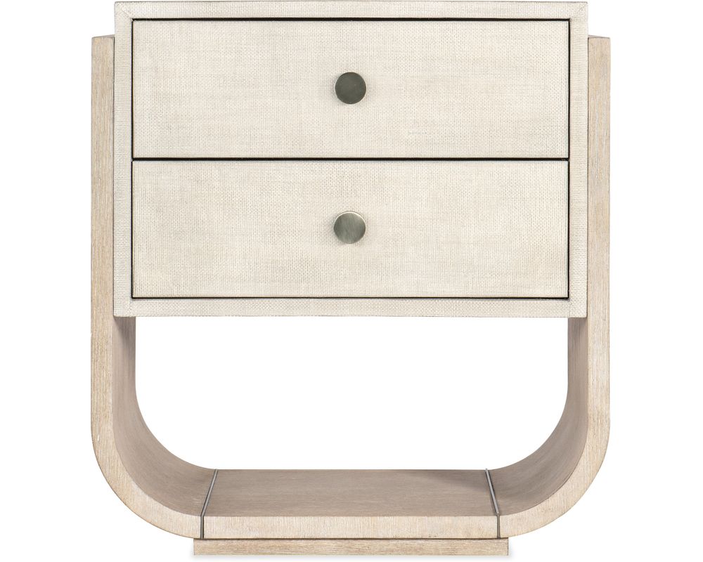 From Sofas and Sectionals.com: The Modern Mood Two-Drawer Nightstand is the perfect addition to any modern bedroom. This nightstand is symmetrical and monochromatic, making it stylish and timeless. The combination of materials used in its construction adds a touch of luxury to its overall appearance. The case of the nightstand is crafted from high-quality Oak Veneers with a wire-brushed Diamond finish, giving it a sleek and sophisticated look. The drawer fronts and top are wrapped in raffia, providing a unique texture and visual interest. To add a touch of elegance, the nightstand is trimmed in metal with warm brushed-nickel knobs.