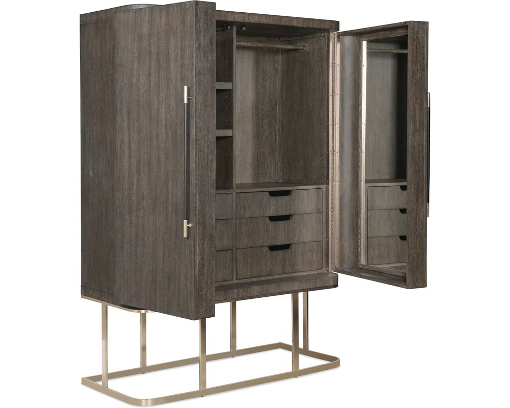 One of the most striking features of this wardrobe is its modern design. The shaped metal base gives it a unique floating appearance, adding to its aesthetic appeal and making it sturdy and durable. The cabinet also features two large wood doors with piano hinges, enhancing its sleek and modern look. This wardrobe is not just a piece of furniture, it's a statement of your modern and stylish taste.