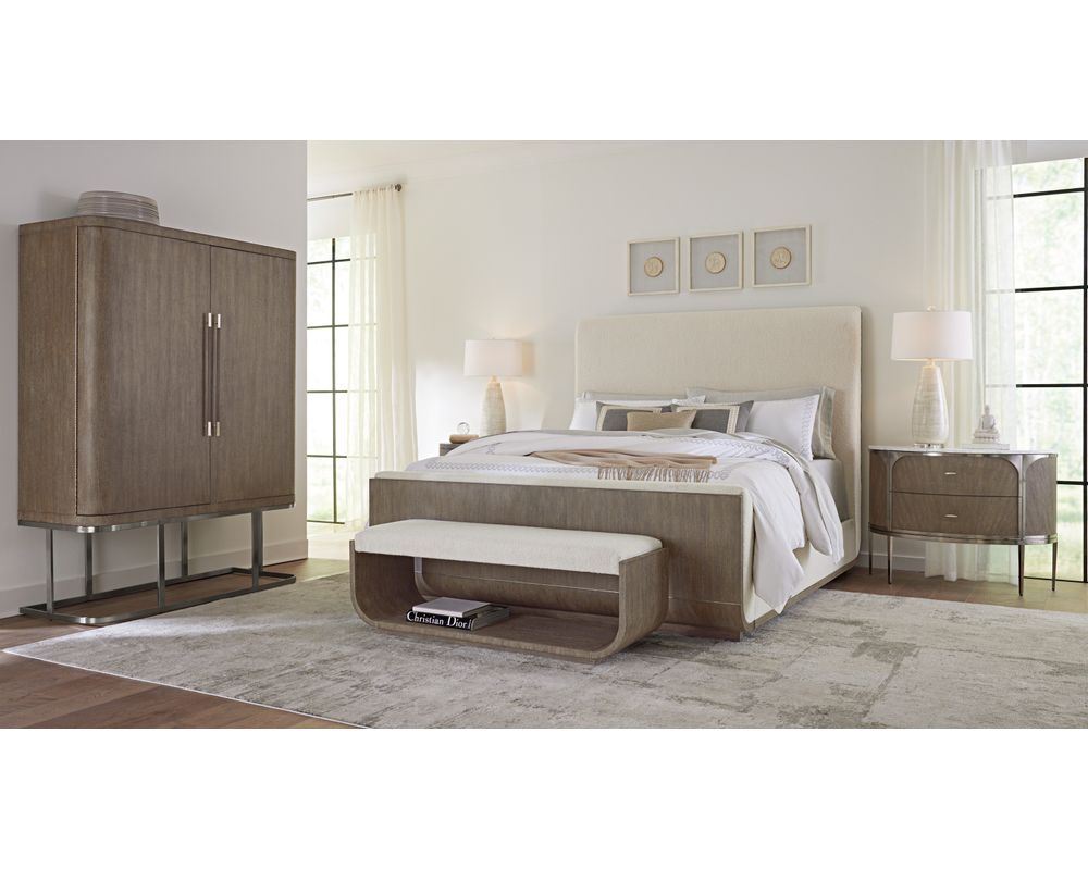 Unbound by geographical design, Modern Mood presents itself as an evolution of design choices, spanning various decades and design movements while maintaining an unmistakably modern aesthetic that transcends time. The 90-piece collection includes a bedroom, dining room, home office, accent, and occasional items characterized by substantive forms with soft architectural details. Elevated materials and brushed metal accents in a warm pewter finish are evident throughout the collection, including metal banding and edging and marble and glass accents. Crafted with flat-cut quartered oak veneer with wire-brushed detailing, Modern Mood is presented in two finishes: Mink and Diamond. Delivering a dark, earthy brown with notes of black, Mink provides a timeless aesthetic. With its crystal-like alabaster and pewter hues, the Diamond finish delivers a soft sophistication, evoking a sense of luxury and refinement.
