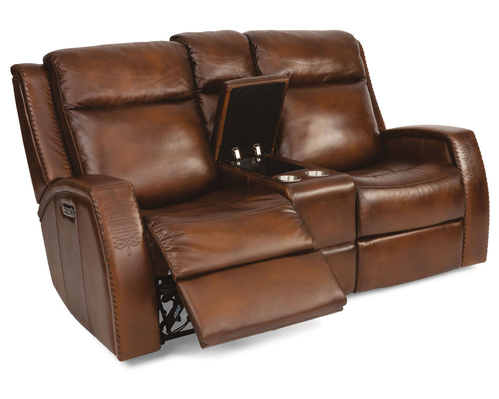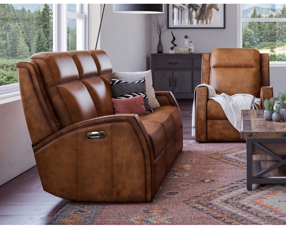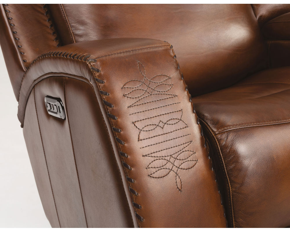 Double down on comfort and style with the Mustang Power Reclining Loveseat with Power Headrests. Outfitted in a premium full-grain leather for a high-end look and feel that will only become more enhanced over time, this Western-inspired recliner features an intricately stitched pattern-reminiscent of cowboy boots-on the arms. Contrasting color stitching on the seams enhances durability and makes a bold design statement. Both you and a companion can comfortably recline in the loveseat using power controls in both arms. Featuring built-in USB ports for charging devices, the power controls independently adjust the headrests and recline, so you can find the perfect position for relaxation. Features including plush, divided back cushions, bucket seats and fully padded footrests help you relax. This loveseat is built to last, thanks to our patented DualFlex Spring System™, which ensures a mix of firmness and flexibility as you sit.