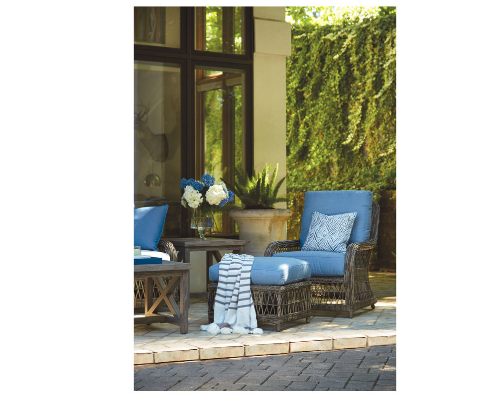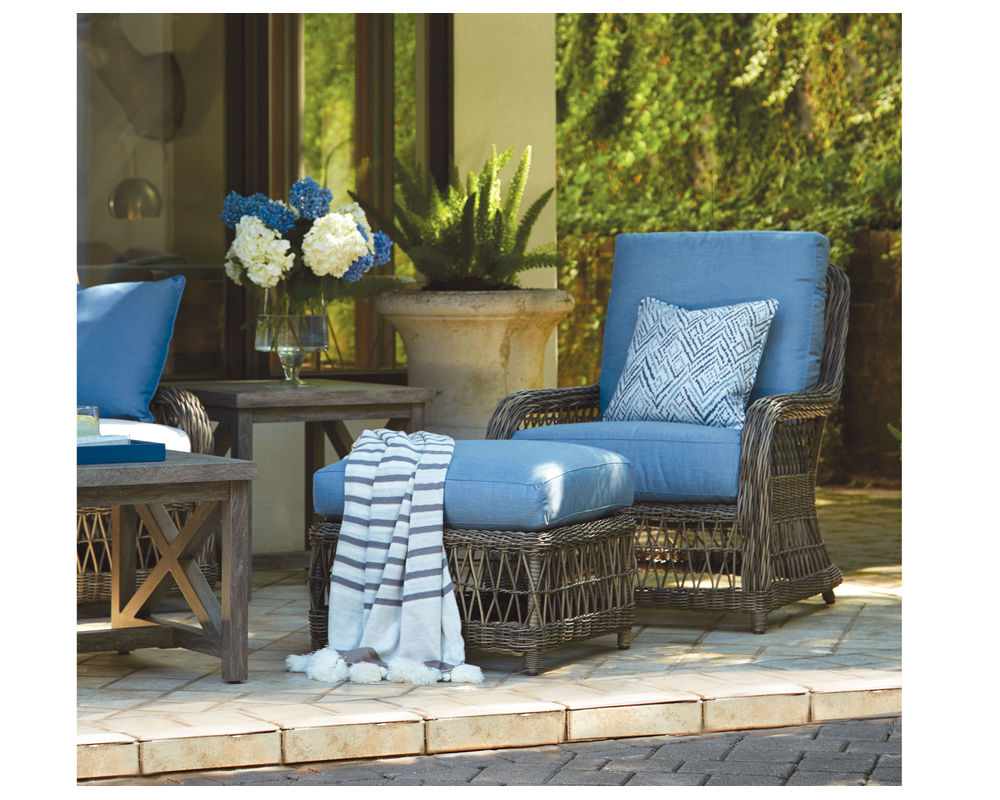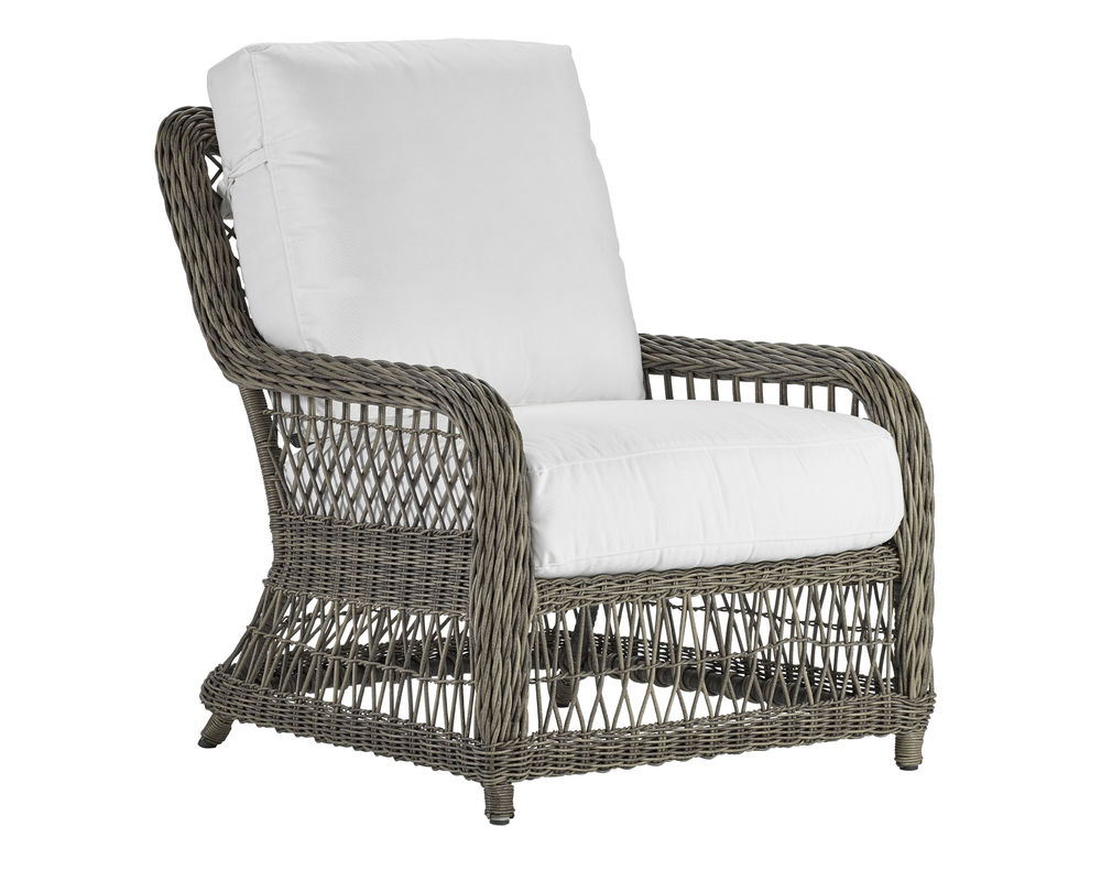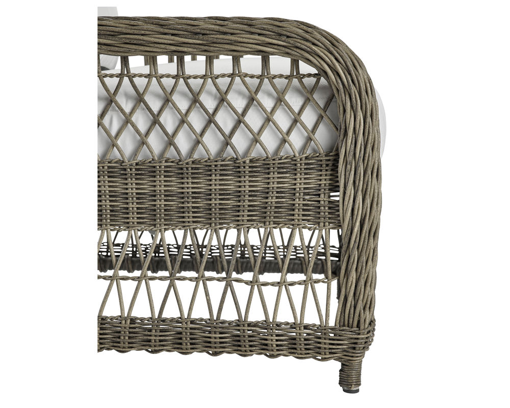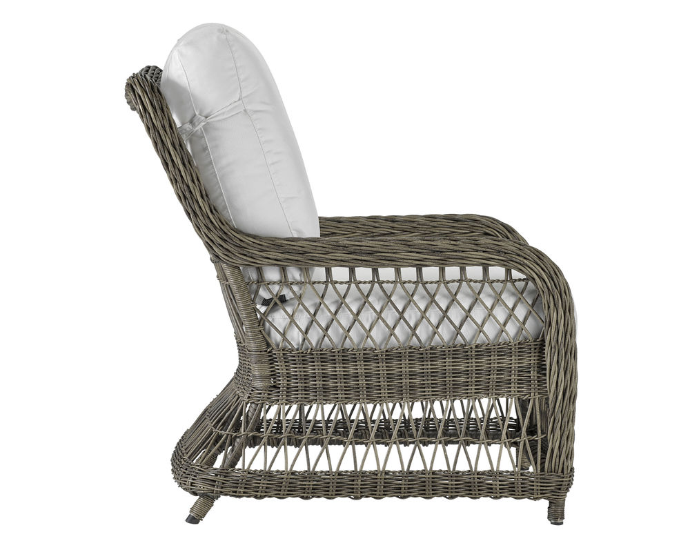 Our Mystic Harbor lounge chair features a light and airy feeling with the classic "X" pattern intricately woven into the back and arm. The classic wicker design of this collection features luxurious and plush comfort synonymous with our Weather Master ultimate outdoor cushion. Varying shades of warm French Grey all-weather wicker are hand-woven around the gentle curves of a premium quality aluminum frame. Upholstery details feature cushions with weltless box borders and French seaming.
