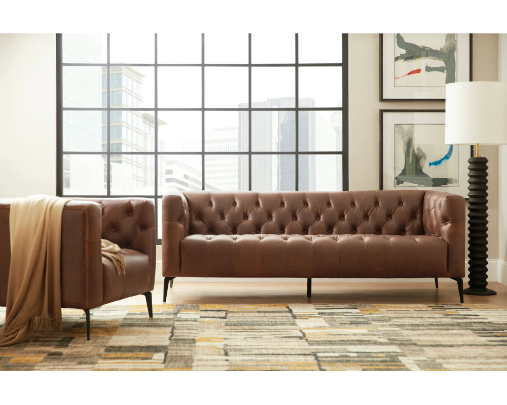 Elevate your living space with the modern sophistication of the Nicolla Leather Sofa. This timeless piece features a refined silhouette with low-profile arms, deep tufted detailing, and sleek metal legs. Upholstered in rich Saddlebag Lodge Aniline leather, it offers a luxurious feel and authentic character that adds depth to any contemporary or urban interior. Designed for lasting quality and style, the Nicolla is meticulously hand-crafted using some of the finest leathers in the world.