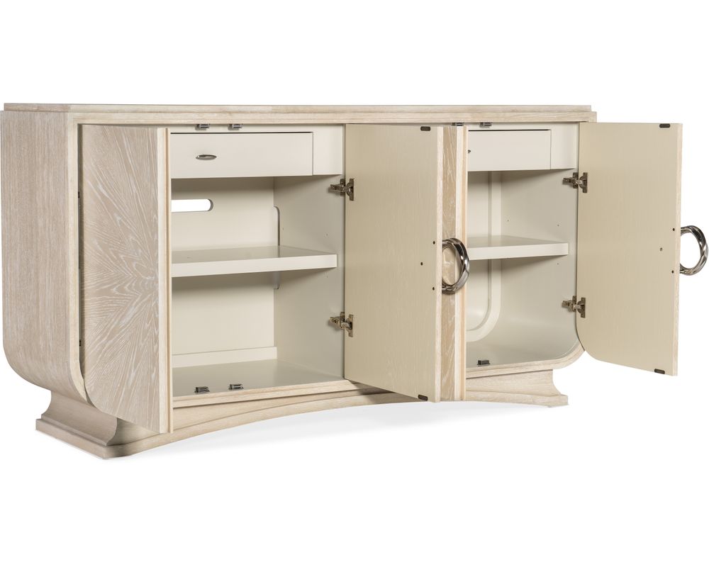The Nouveau Chic Buffet offers ample storage space with four doors, each equipped with soft-close hinges and magnetic door catches for smooth and secure closure. Behind each set of doors, you will find a self-closing drawer, providing a convenient storage solution for all your dining essentials. The left-side drawer also includes a drop-in felt-lined silver tray, perfect for organizing and protecting your silverware.