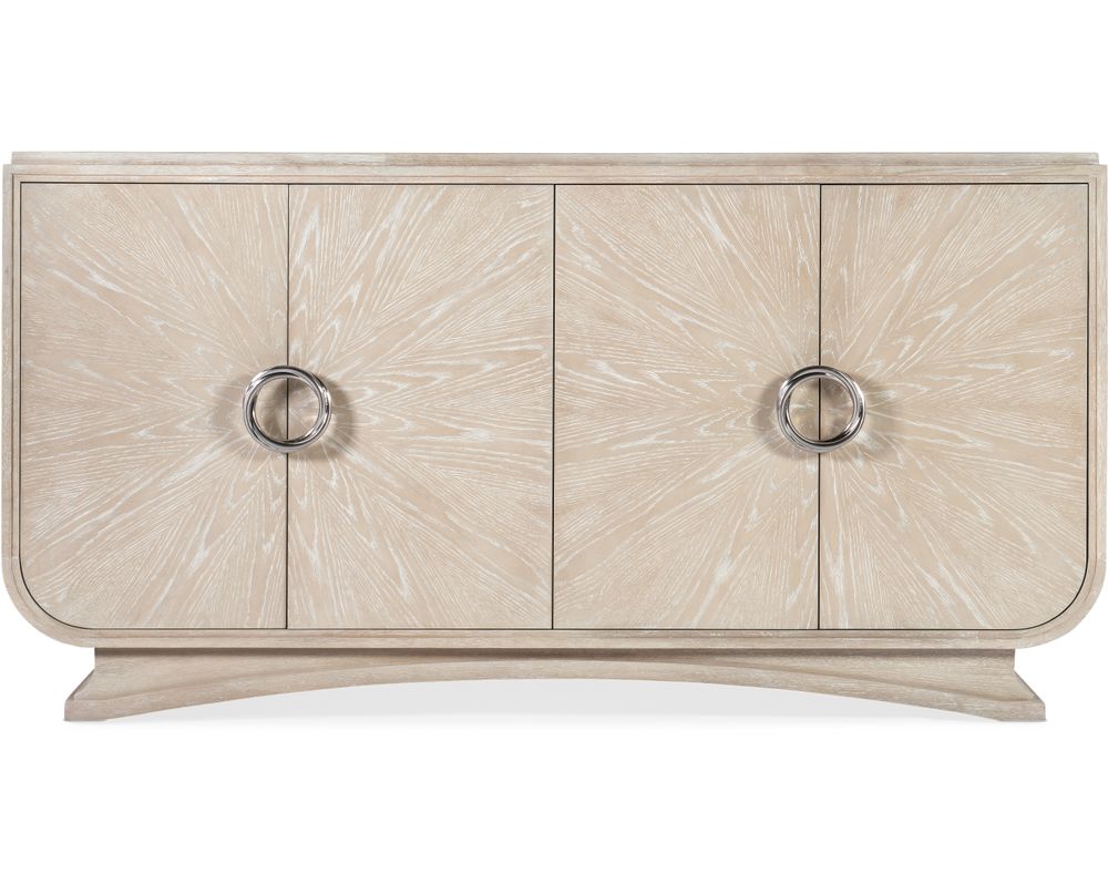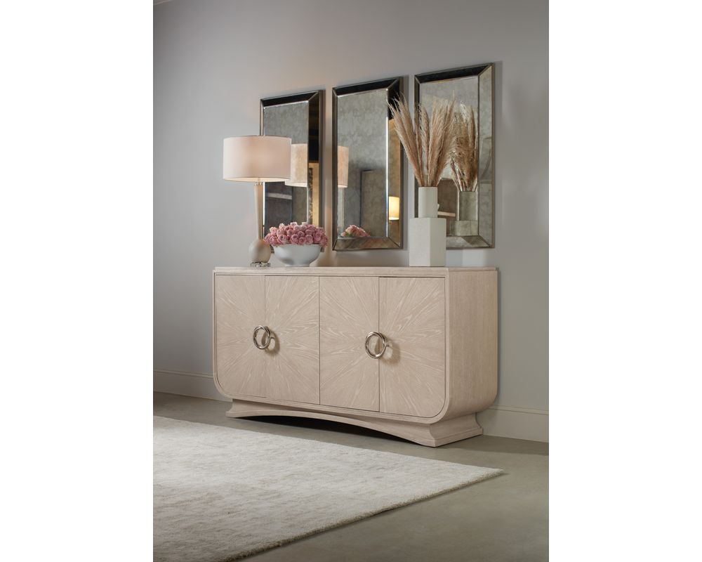 From Sofas and Sectionals.com: Introducing the Nouveau Chic Dining Buffet – a stunning piece that seamlessly combines classic architectural design, soft shapes, and faux metal accents to create an exquisite and functional piece of furniture. Crafted with care from high-quality Cathedral and Quartered Oak Veneers, this buffet features a soothing Sandstone finish that will complement any dining room décor.
