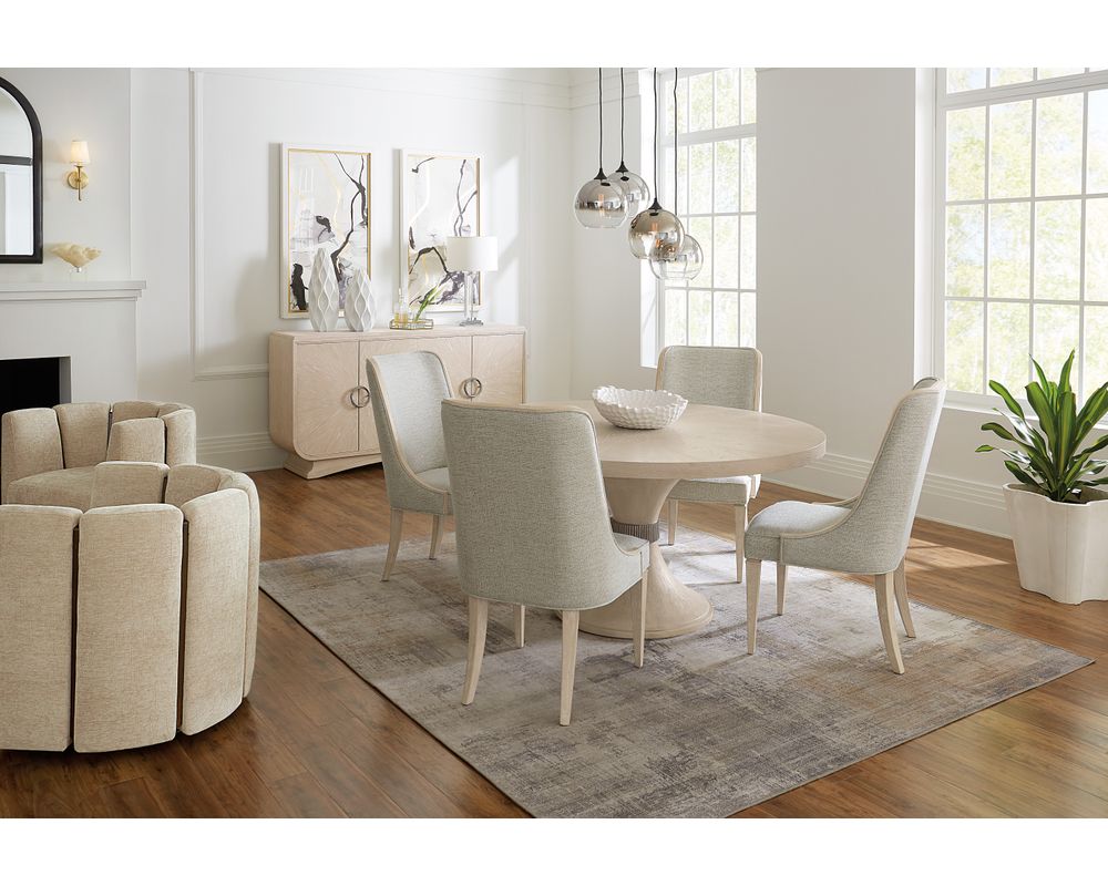 The Nouveau Chic Collection is a casual modern group drawing inspiration from the curvaceous yet uncomplicated designs that are popular today. Nouveau Chic unites classic architectural elements like cathedral and quartered oak, movement of soft shapes, metallicized shagreen, and polished metal accents to create a dramatic yet easy modern aesthetic.