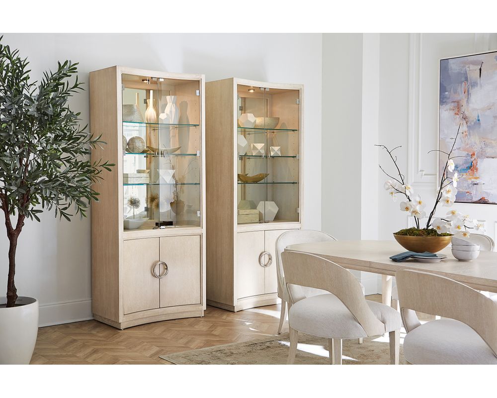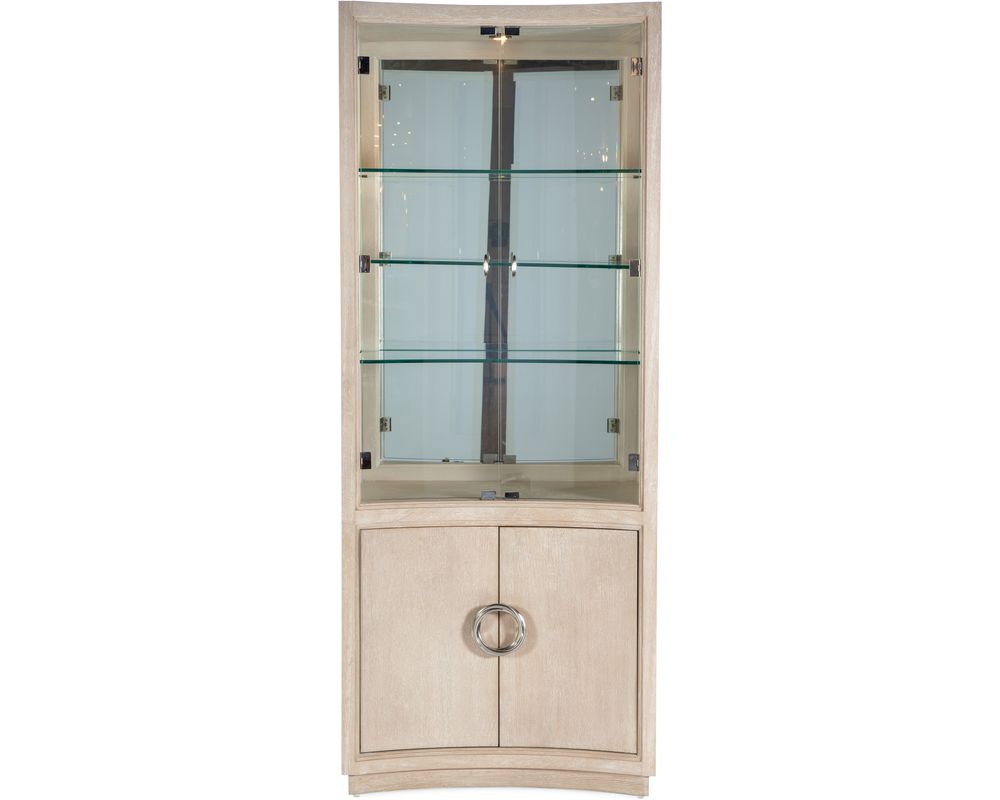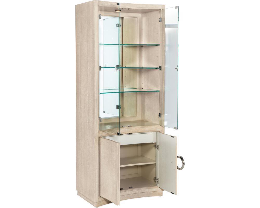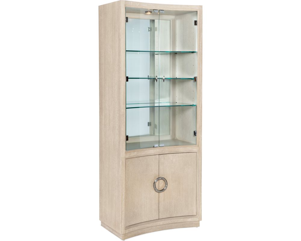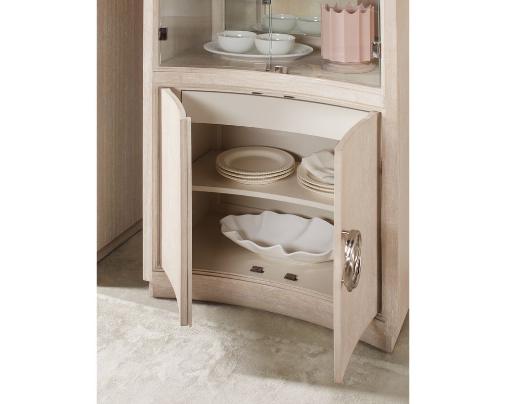 The Nouveau Chic Display Cabinet boasts a transitional style, making it a versatile addition to any home decor. With its cathedral and quartered oak veneers and light wire brushing, the sandstone finish creates a serene and sophisticated look. The large round twist door pull with a nickel finish on the bottom doors adds a touch of modernity, while the small nickel.