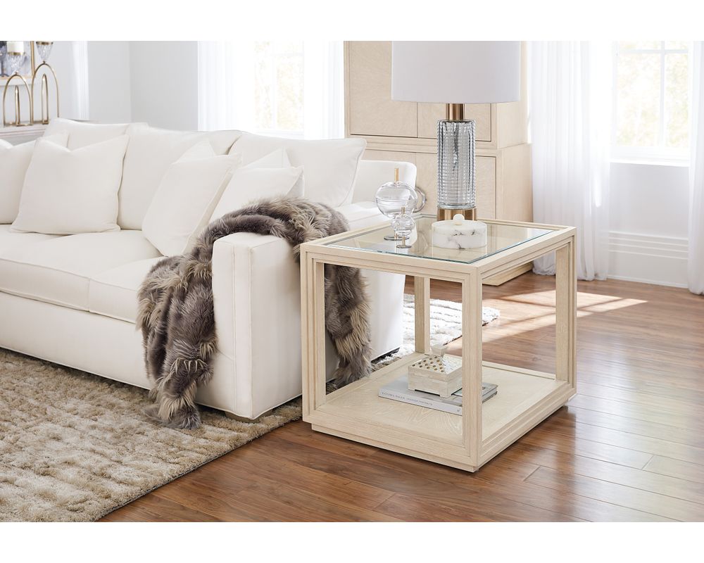 From Sofas and Sectionals.com: Introducing the Nouveau Chic End Table—the perfect combination of style and functionality. Crafted with high-quality oak veneers, tempered glass, and metal, this end table is built to last. Its rectangular shape lends a modern touch to any living space.