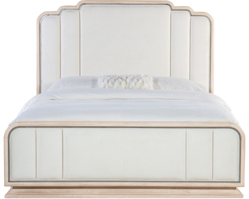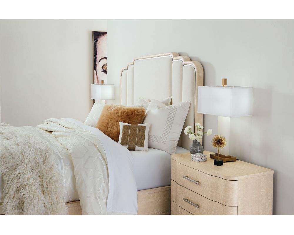 The Nouveau Chic collection is known for its transitional style, seamlessly blending traditional and contemporary elements. This bed is no exception, combining the classic look of oak veneers with the modern touch of fabric and silver accents. The result is a timeless piece that will elevate the look of your bedroom.