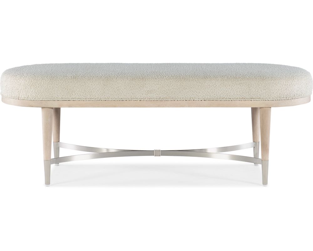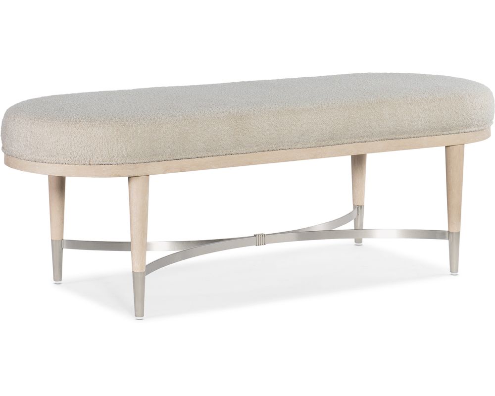 From Sofas and Sectionals.com: Introducing the Nouveau Chic Upholstered Bench, a must-have piece for any modern and stylish home. This bench features a narrow, oval shape that adds a touch of sophistication to any room. The legs of the bench are adorned with metal ferrules and a metal stretcher, adding a touch of glamour and elegance.