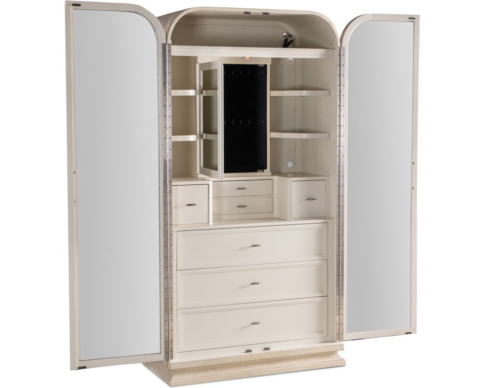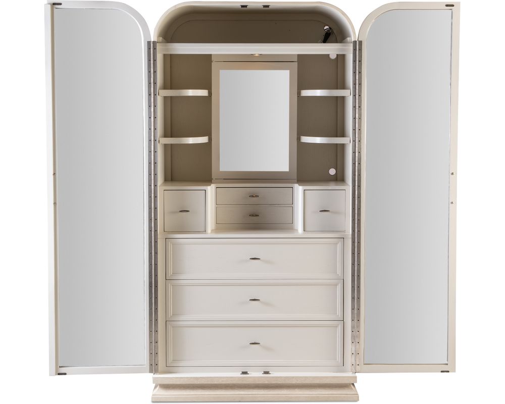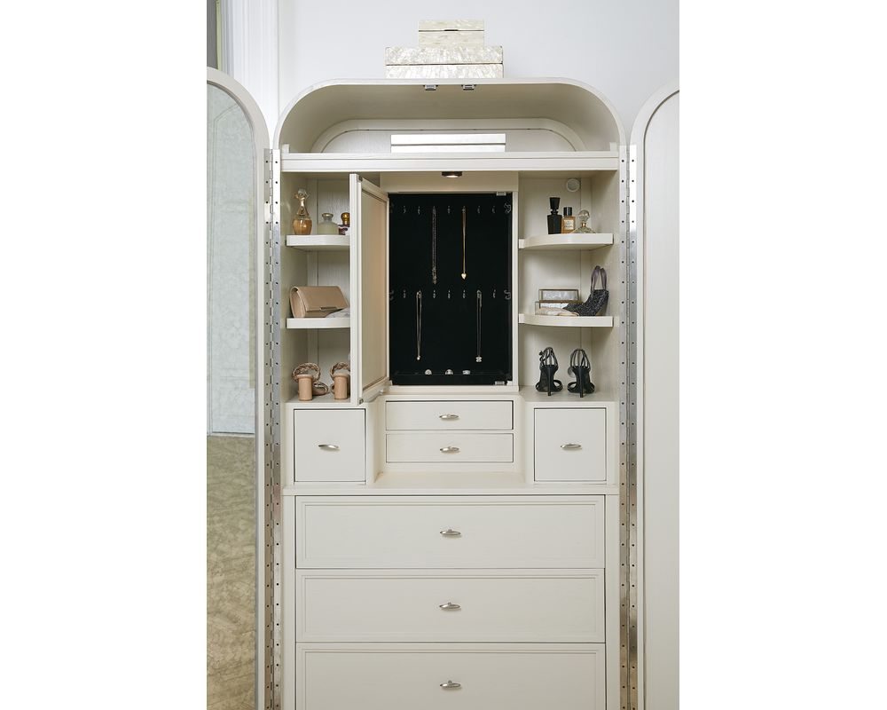 The wardrobe also offers ample storage space with four adjustable wood shelves and one fixed shelf. A puck light with a three-intensity touch switch is located on the back panel, providing convenient lighting for selecting your outfit. For added convenience, two small felt-lined drawers are underneath the interior door, and two small square felt-lined drawers for storing smaller items.