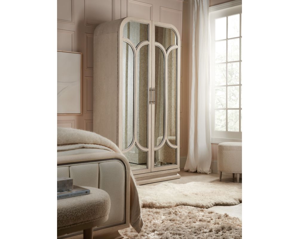 From Sofas and Sectionals.com: Introducing the Nouveau Chic Bedroom Wardrobe, a stunning and functional piece of furniture that combines elegance and practicality. This wardrobe features two doors with beautiful antique mirror glass and intricate fretwork on the fronts, adding a touch of vintage charm to your bedroom decor.