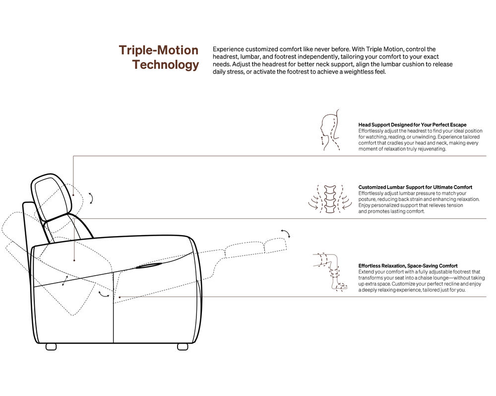 ✅ Triple Power Motion mechanism — independently adjusts headrest, lumbar, and footrest for total comfort