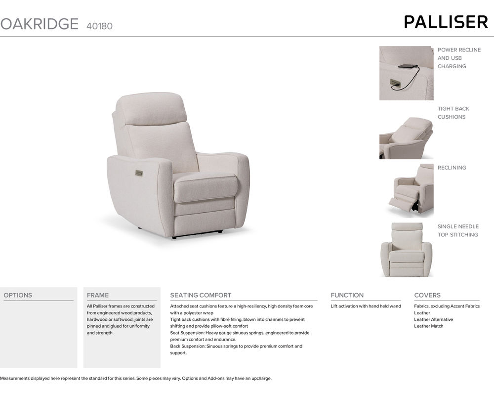 From Sofas and Sectionals.com Introducing the Oakridge 40180-A1 Leather Power Wallhugger Recliner, a luxurious and modern take on the classic recliner chair. With its clean piping details and curved, contoured arms, this recliner exudes upscale appeal and adds a touch of elegance to any home.