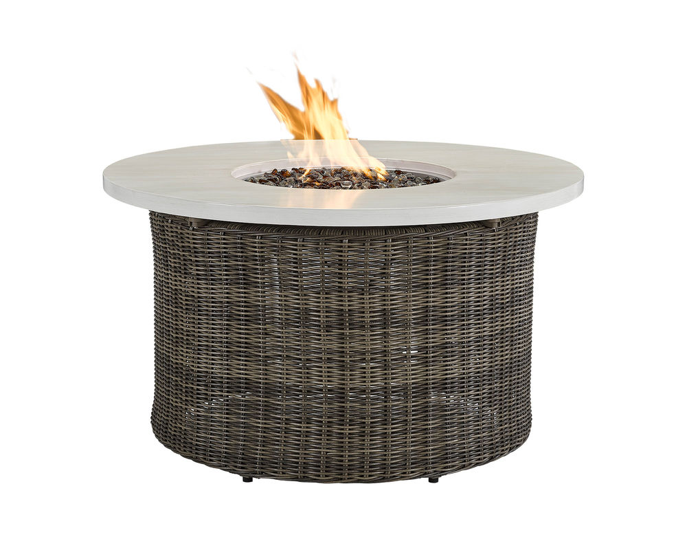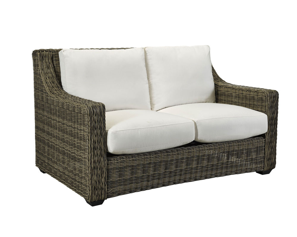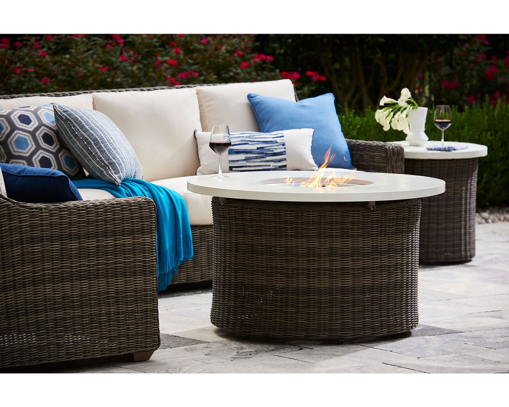 Oasis Outdoor Collection by Lane Venture Oasis collection features a transitional design with gently sloped arm and generous seating. Finished in ash, the variegated tones of warm gray are handwoven in a classic basket weave, and the arm panels feature a plaited chevron design.The deep seating is available in both sofa and sectional options.