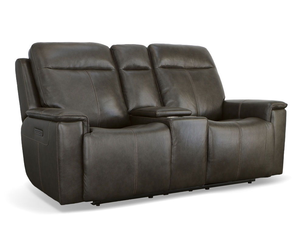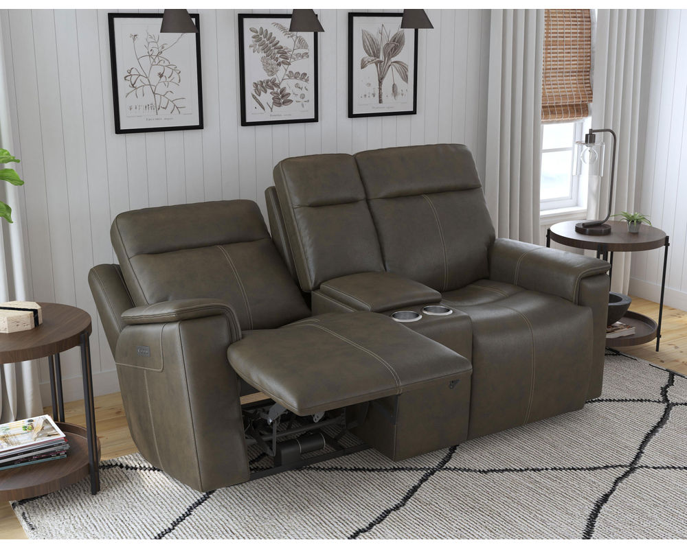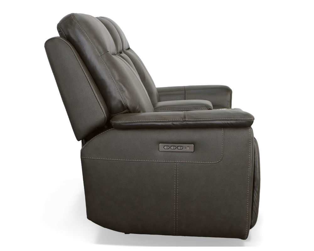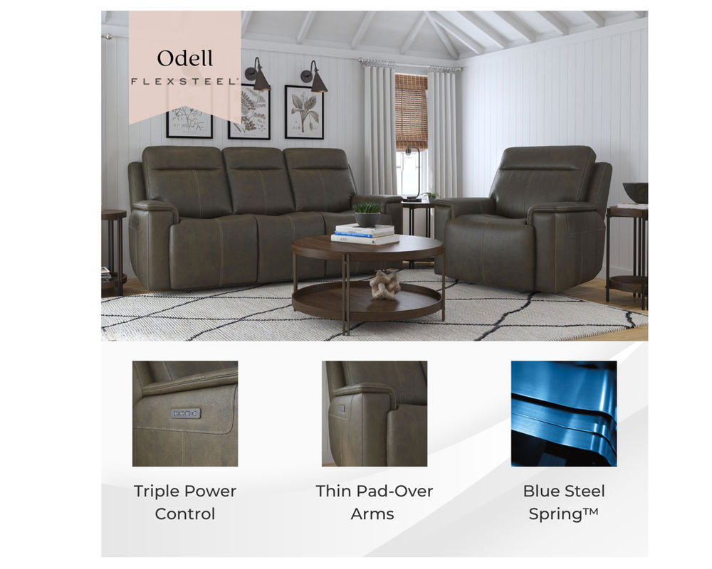 The Flexsteel Odell 1739 Power Reclining Console Loveseat is the perfect combination of ergonomic support and stylish design. Its modern silhouette is characterized by clean lines, thin pad-over arms, and subtle pull tufting on the high-divided backs, adding a touch of sophistication to any living space. With triple power functionality, you can independently adjust both headrests, and lumbar support, and recline to achieve the perfect level of relaxation. Plus, Zero Gravity technology creates a feeling of weightlessness, reducing pressure on the body. It also includes convenient built-in USB ports for easy device charging and a storage console for keeping beverages and remotes within easy reach. Available in two beautiful color options, the Odell Loveseat is upholstered in luxurious, long-lasting top-grain leather. With its ergonomic design and stylish look, the Flexsteel Odell 1739 Power Reclining Console Loveseat is the perfect choice for any home.