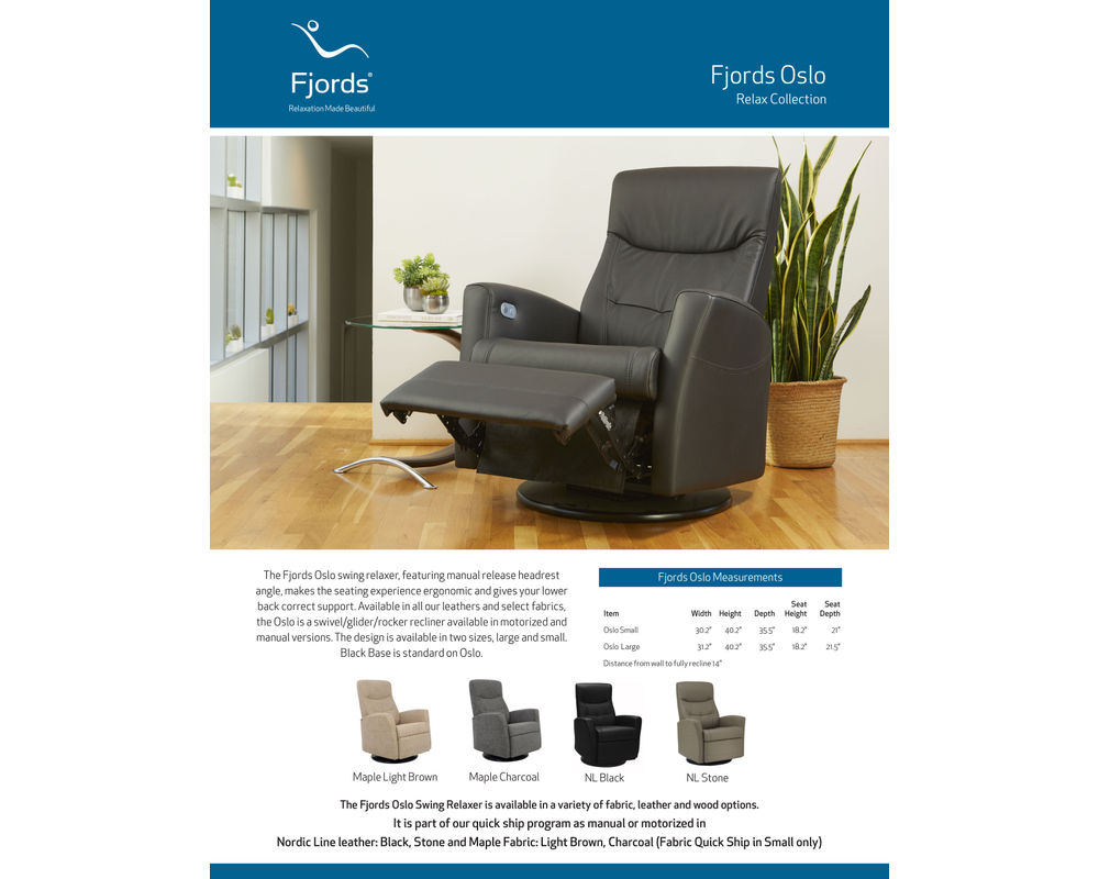 Experience the perfect balance of refined design and exceptional comfort with the Oslo Relaxer Recliner from Fjords. Crafted with Norwegian ergonomics and premium materials, the Oslo is designed to move with your body — offering superior support whether you’re sitting upright, gently gliding, or fully reclined. Its clean Scandinavian lines and thoughtful engineering make it an ideal choice for customers who want modern style without sacrificing comfort or durability.