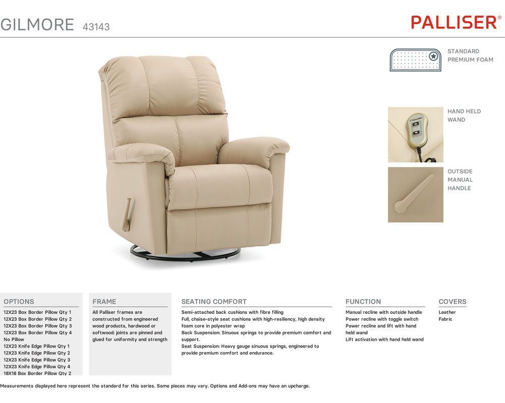 • All Palliser cushions are crafted to rigorous quality standards for superior comfort, support and endurance. High-density, high-resiliency seat foam is used to ensure years of quality seating.