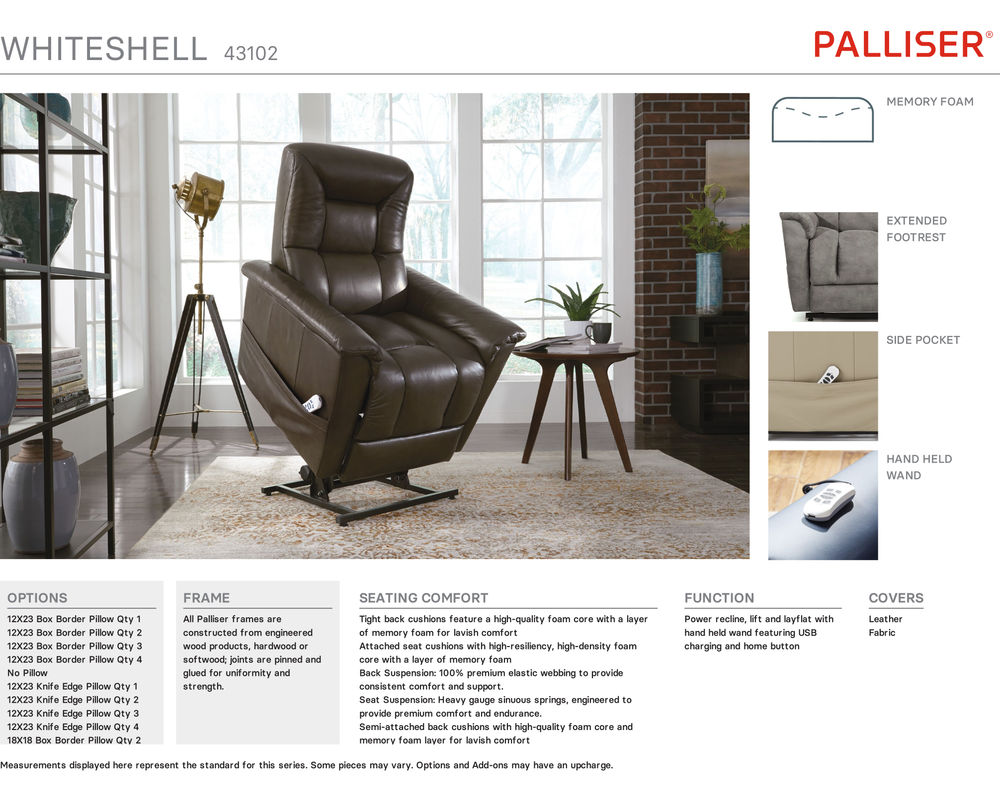 A classic with a contemporary flair, the Whiteshell lift recliner is like no other. The well-defined seating and back details feature a luxurious memory foam, perfect for those who sit for long periods of time. With pillow top foam arms and a deeply channeled seat and back cushion, the Whiteshell offers irresistible comfort.