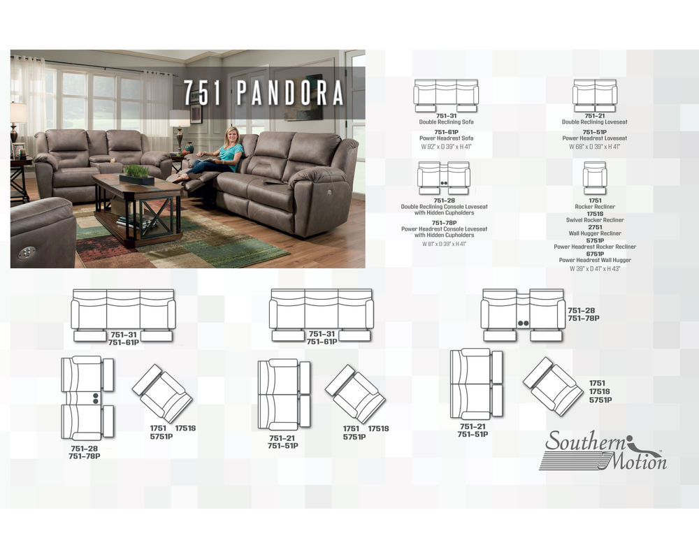The unique styling of the sleek Southern Motion 751P Pandora Reclining Sofa group comes from its pub backs, center stitching, and French seam shaping which lend to its transitional character, fitting in splendidly with your entertaining lifestyle. Outfitted in your choice of gorgeous fabrics and leathers, the USA-made sofa group also has available accent seating in a matching rocker recline or wall hugger. For superior comfort and wear, the seat cushions are high-density, compression, and fiber-wrapped to provide years of satisfying use.