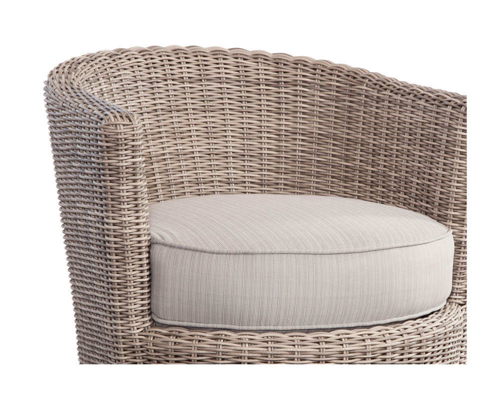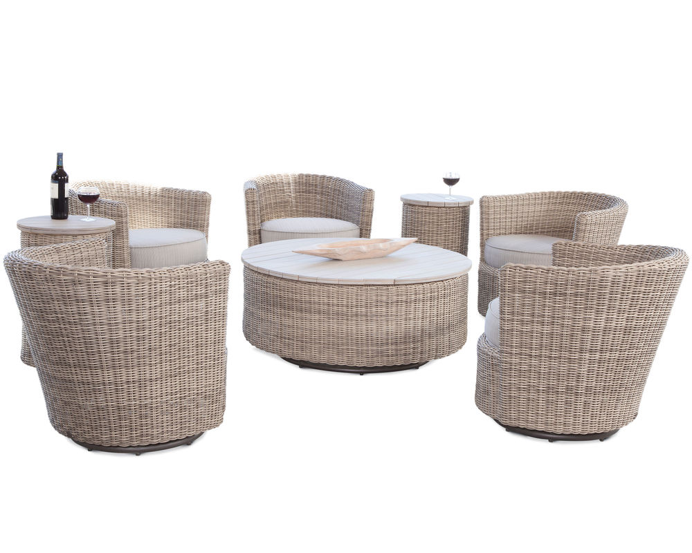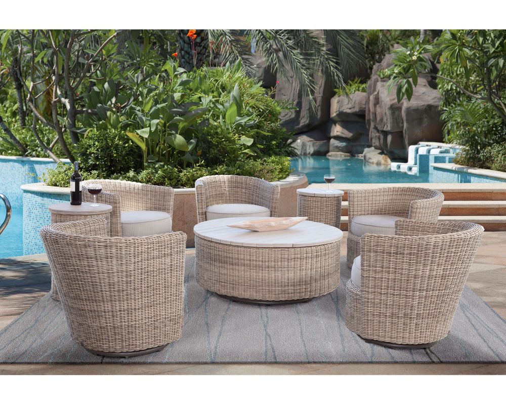 The Paradise Bay Chat Table and (4) Swivel Chairs is great to accompany your patio furniture. Teak wood tops and resin wicker bases provide the perfect texture and style. With over 150 high performance outdoor fabrics and fast drying cushion cores this is the perfect outdoor set for your outdoor room. The High performance outdoor fabrics are also available on all indoor upholstered furniture.
