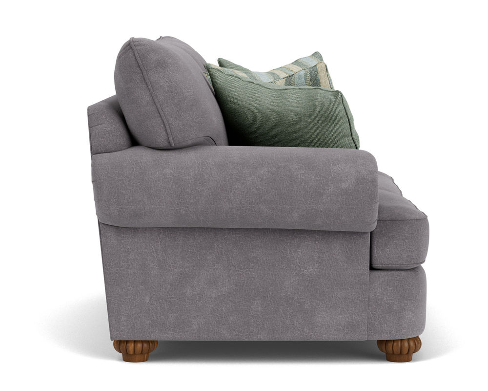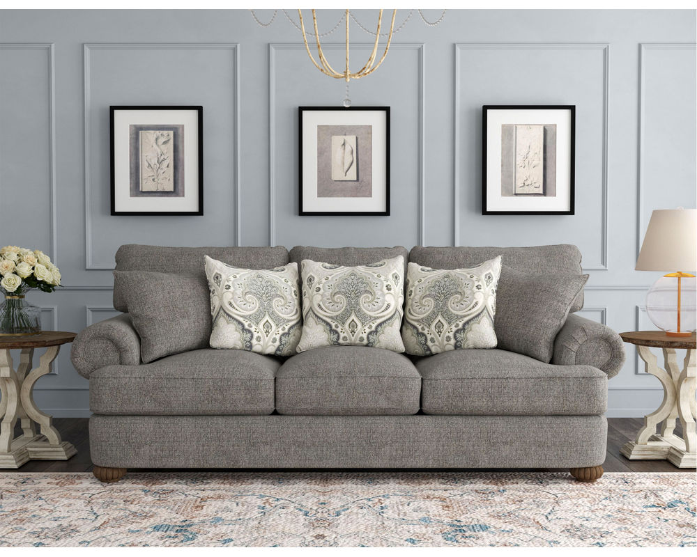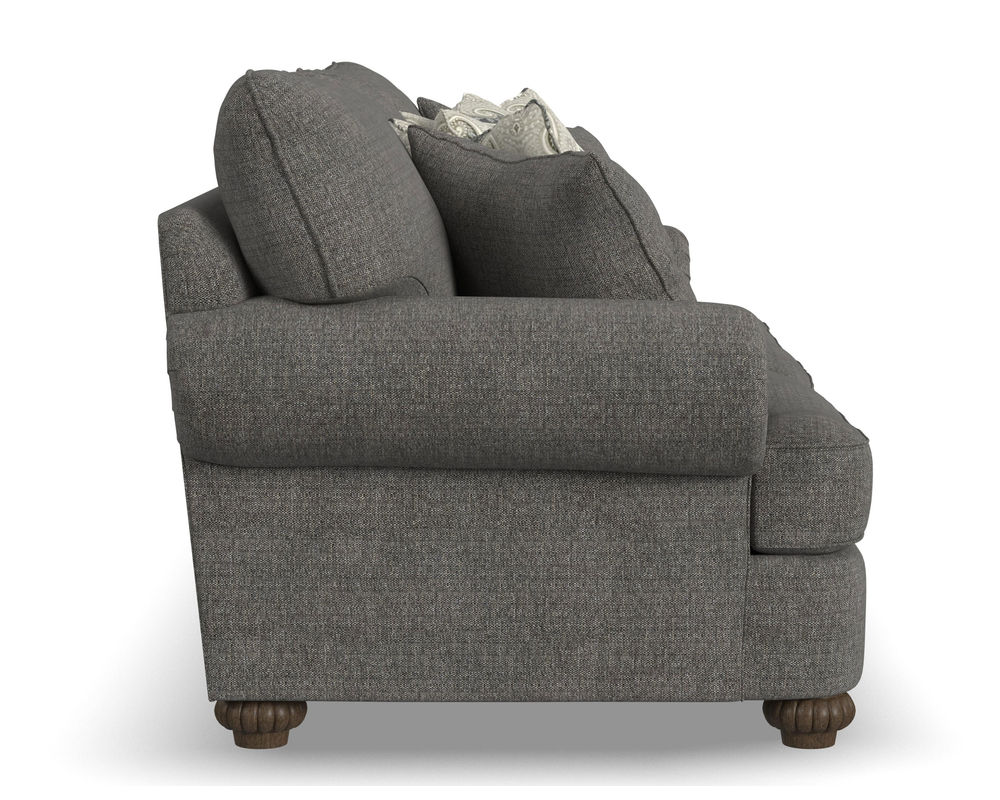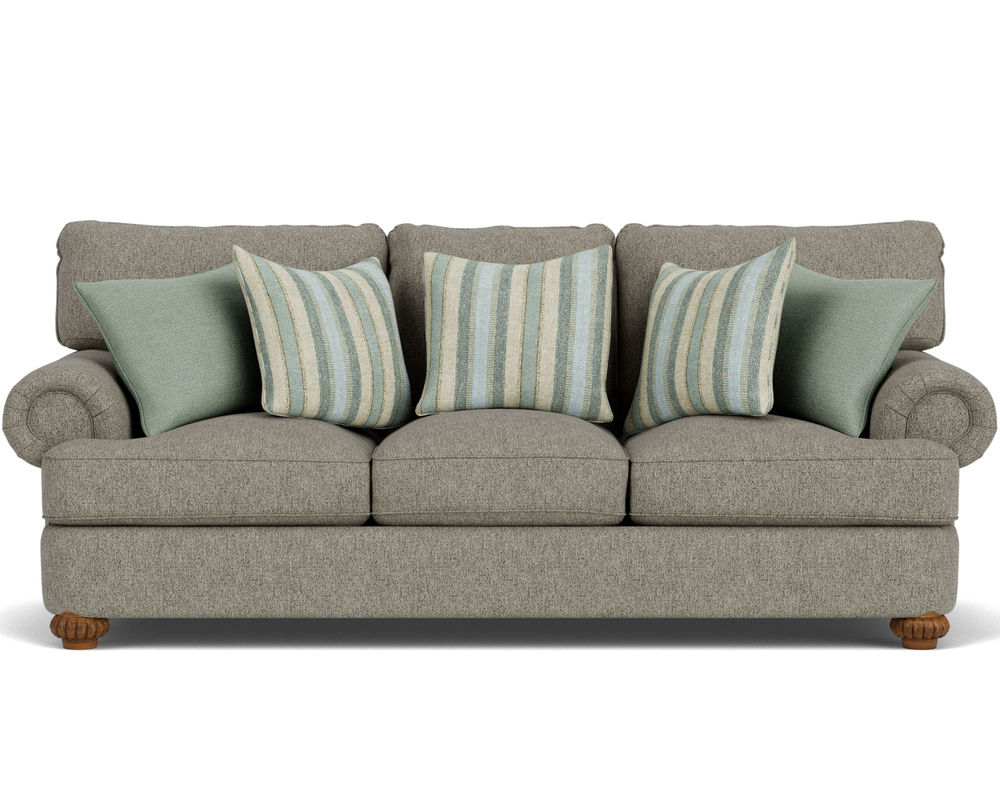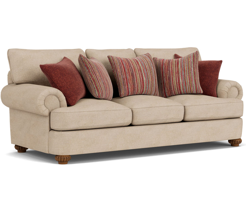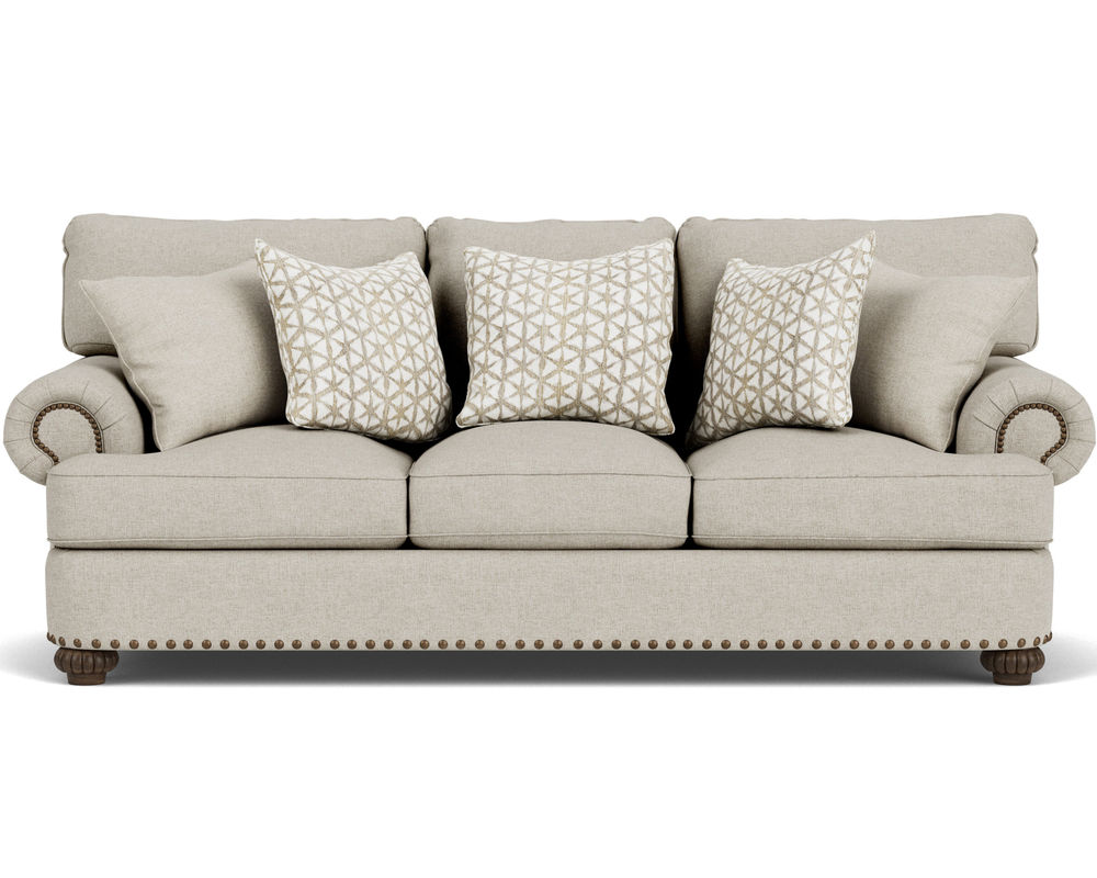 The Flexsteel Patterson 7321 Sofa provides a generous and elegant design that is sure to make a statement in any room. An inviting appearance is created with its prominently rolled arms and padded front rail. The overstuffed seat and back cushions on a large frame make it the perfect spot to curl up and relax. Fluted bun feet and optional nailhead trim add the finishing touches to the Patterson, making it the perfect choice for any home. For an added touch, the Patterson is also available with a nailhead trim for a slight upcharge. Enjoy stylish comfort with the Flexsteel Patterson 7321 Sofa.