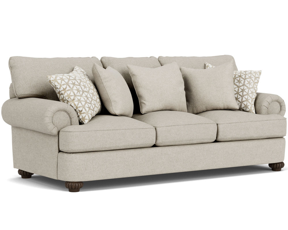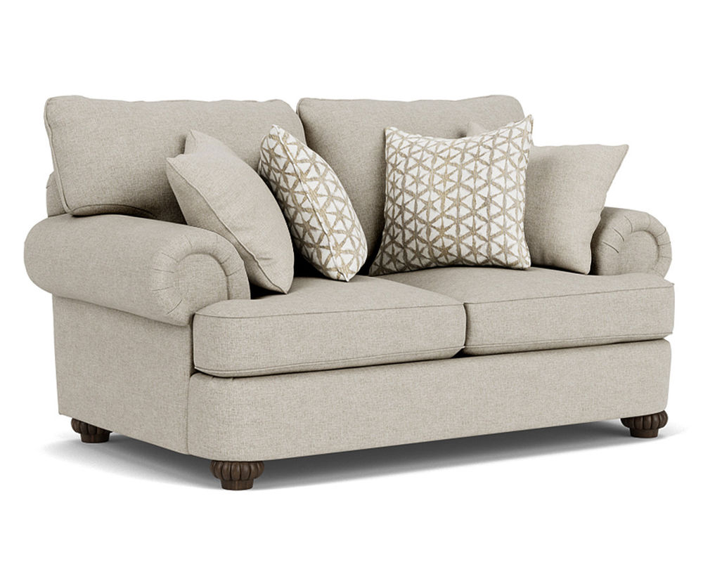 The Flexsteel Patterson 7321 Chair is the perfect blend of elegance and comfort. With generously proportioned seating and a classic, timeless design, it's sure to add a touch of beauty to any room. Its rolled arms and padded front rail provide a welcoming feel and its overstuffed seat and back cushions make it irresistible to curl up on. The fluted bun feet and optional nailhead trim add the finishing touches to its stylish look. It's also available with nailhead trim for a slight upcharge. With a large frame measuring 56" wide, it's roomy enough to fit two people. Whether you use it to relax in or entertain, the Flexsteel Patterson 7321 Chair will be a beautiful addition to your home.