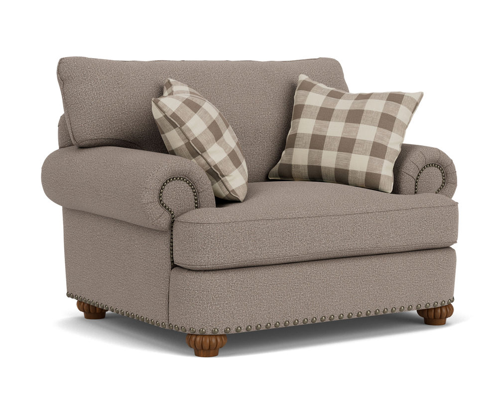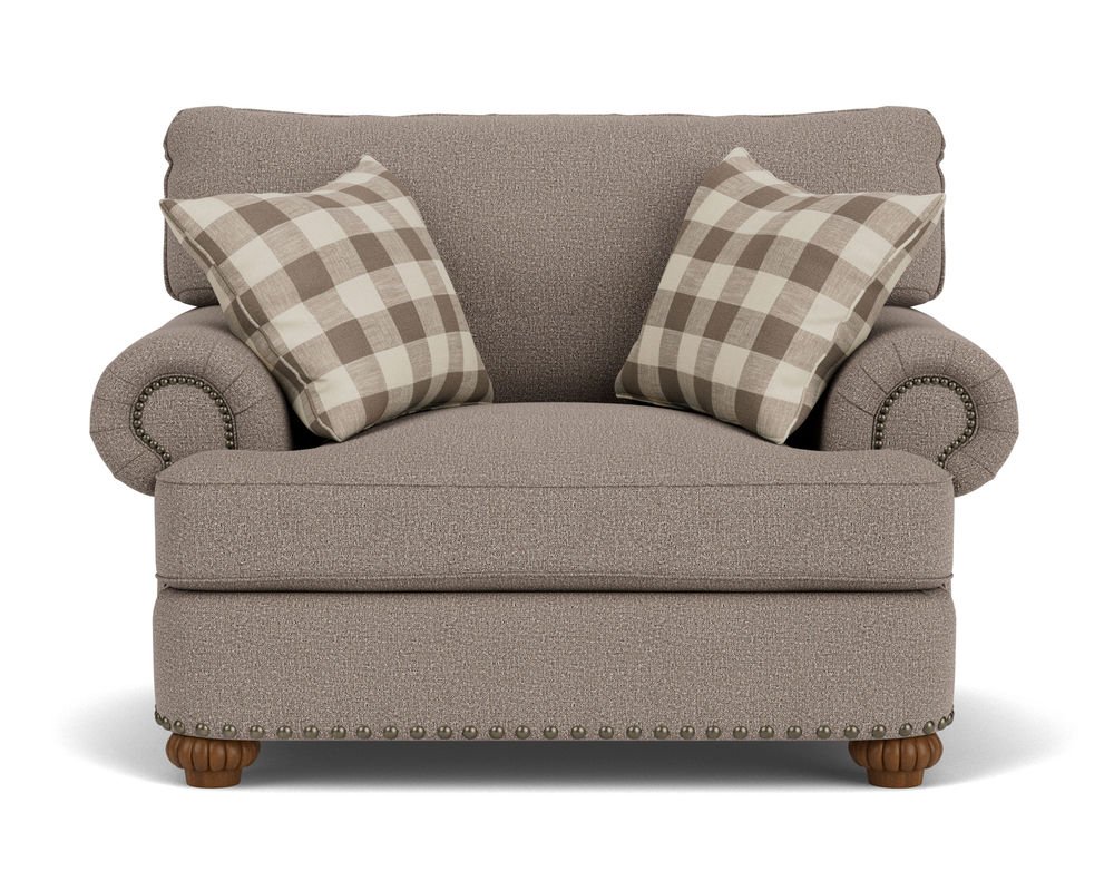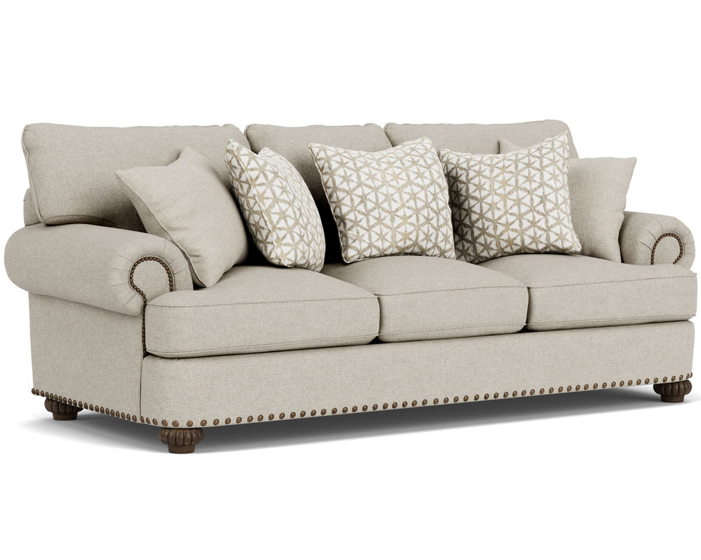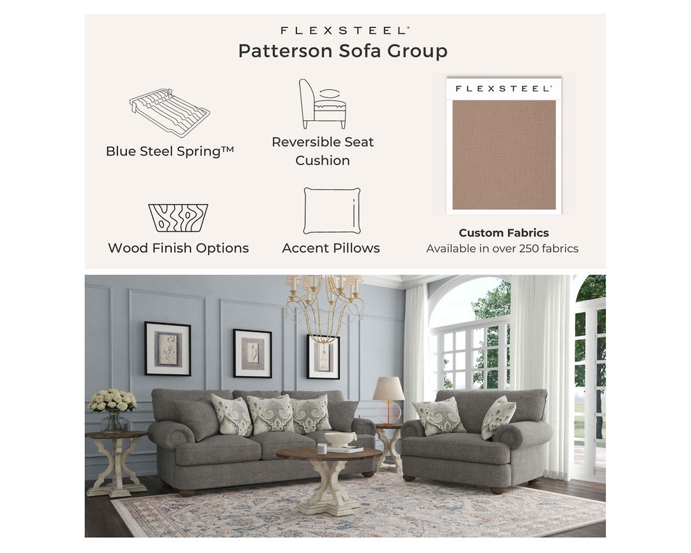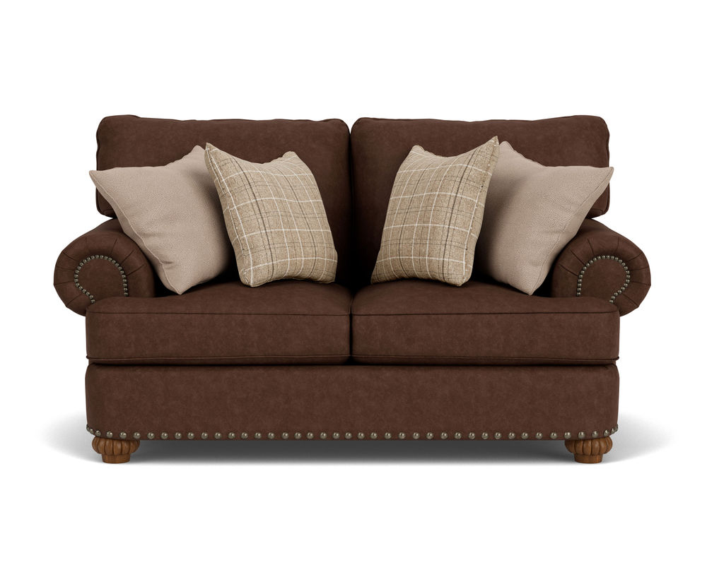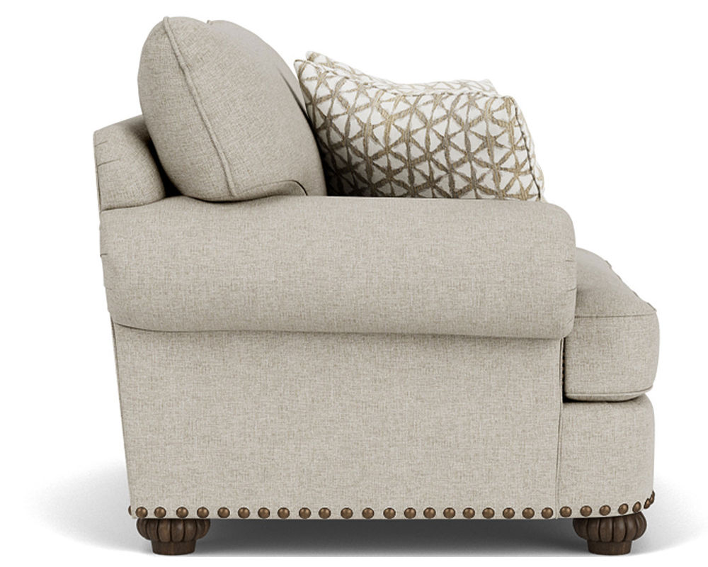 The Flexsteel Patterson 7322 Nailhead Loveseat is the perfect combination of style and comfort. It features generous proportions and an elegant design, with prominently rolled arms and a padded front rail that invite you to sink into its cushioned embrace. Its overstuffed seat and back cushions provide extra comfort, while its large frame makes it the ideal choice for any living room. And with its fluted bun feet and optional nailhead trim, this loveseat adds a touch of sophistication to any space. Whether you're looking for a cozy spot to curl up and watch a movie with friends or a chic addition to your living room, the Flexsteel Patterson 7322 Nailhead Loveseat will provide you with the perfect balance of style and comfort.