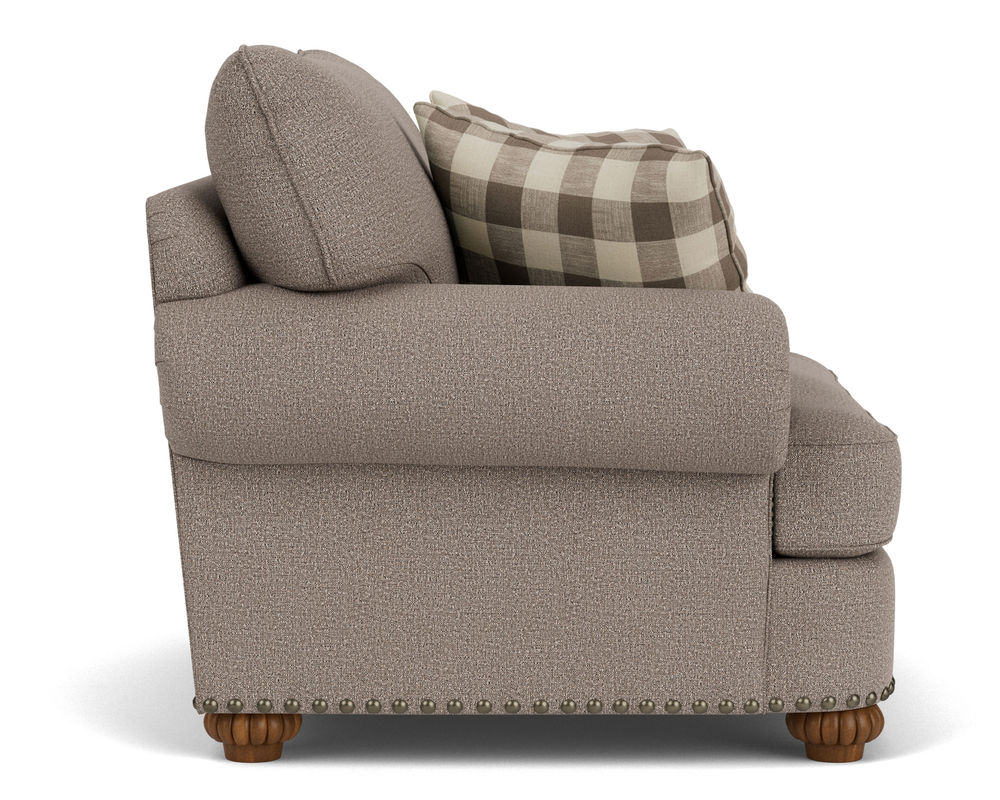 The plush cushion enhances support by featuring a high-resiliency polyurethane foam core wrapped with a layer of recovery foam and a soft fiber wrap