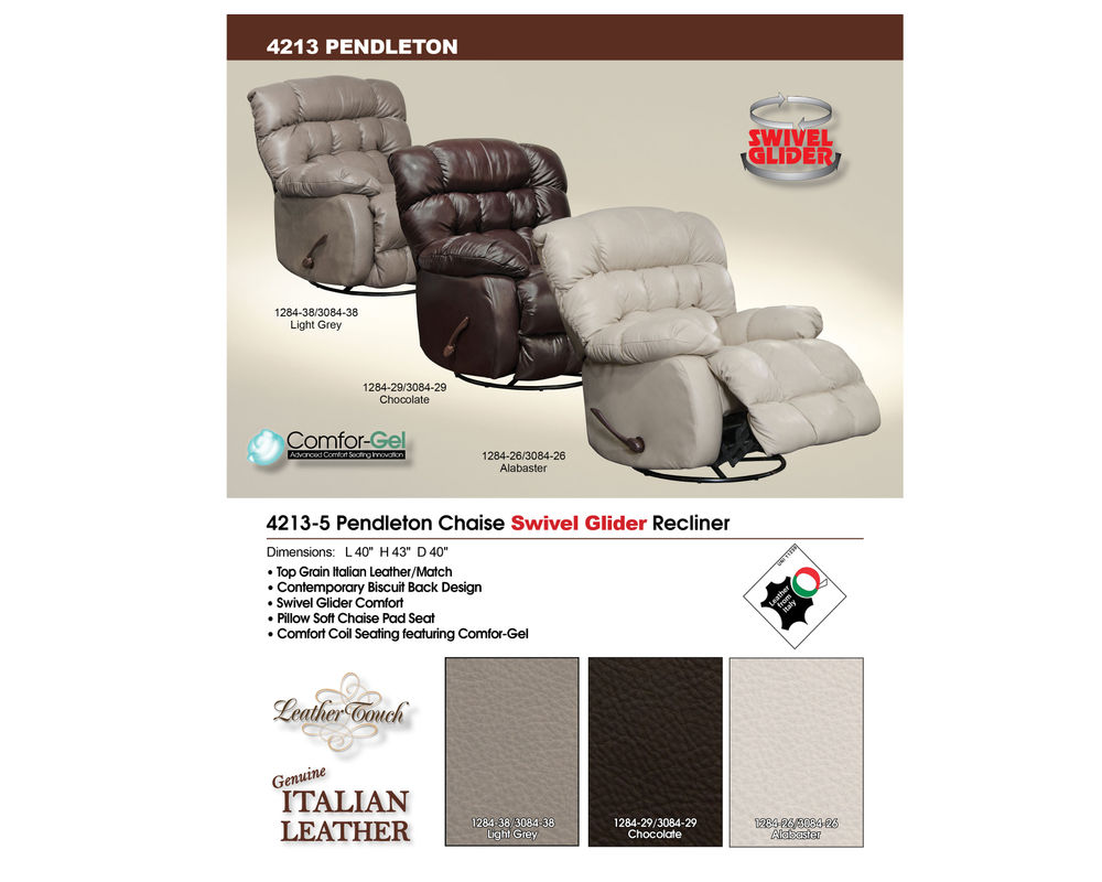 Features Top Grain Italian leather everywhere your body touches in a contemporary biscuit design. Swivel gliding reclining comfort with a pillow soft chaise pad seat. Comfort Coil seat cushions with infused comfort gel.