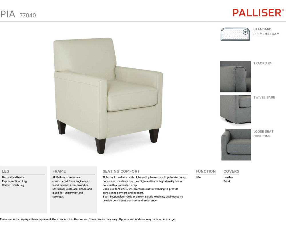 • All Palliser cushions are crafted to rigorous quality standards for superior comfort, support and endurance. High-density, high-resiliency seat foam is used to ensure years of quality seating.