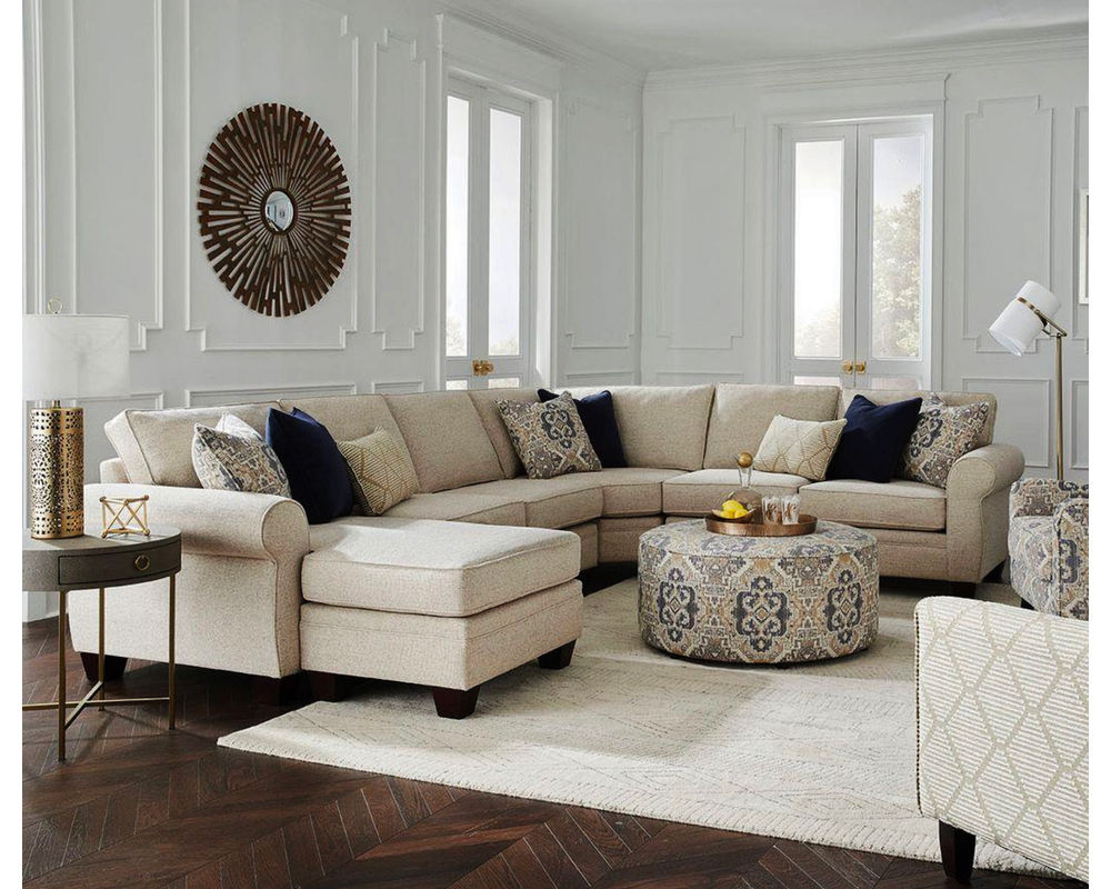The Plumley Bisque Sectional consists of four pieces: a right-arm-facing loveseat, a 90-degree corner, an armless chair, and a left-arm-facing chaise. This allows for versatile placement options in your living space, making it suitable for any room layout.