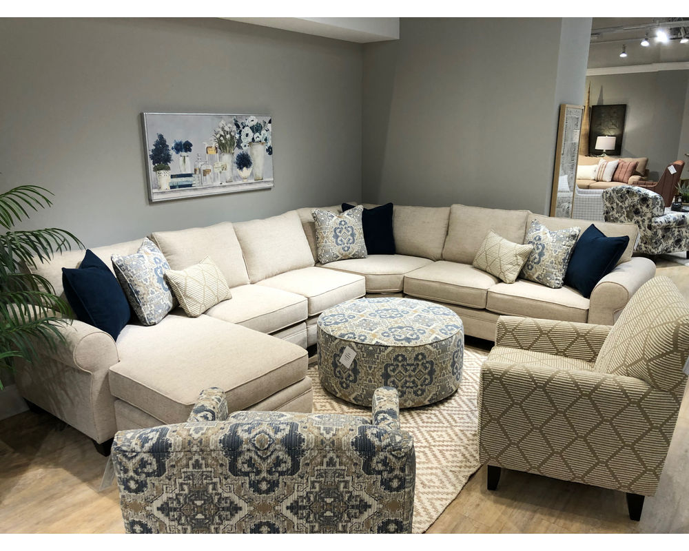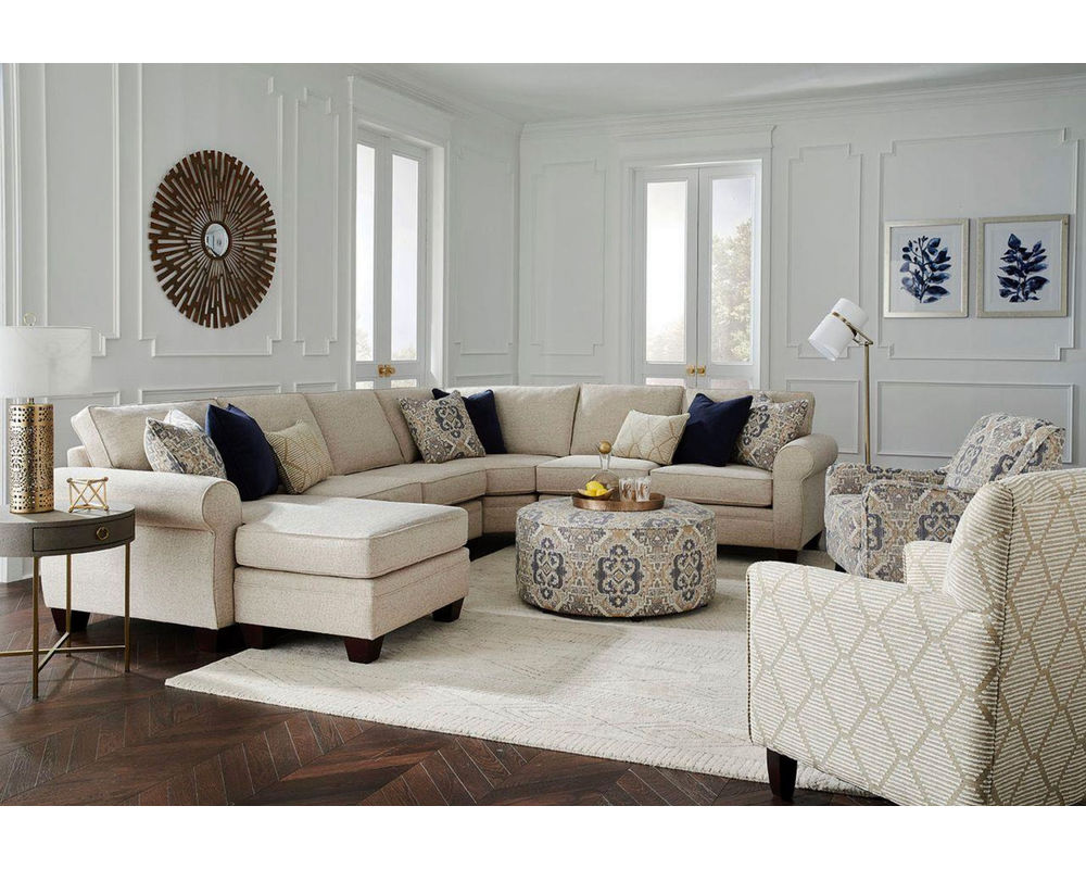 The coffee-finish legs and accent patterns in the Plumley Bisque add a casual, transitional feel to the sectional, making it a perfect fit for any family room. It provides a comfortable and inviting space for the whole family to gather and spend quality time together.