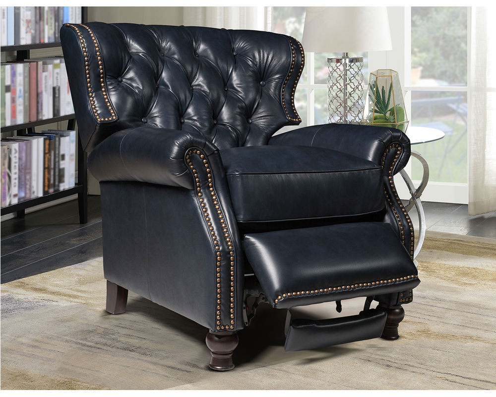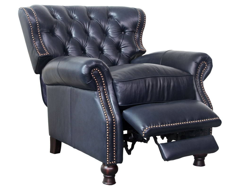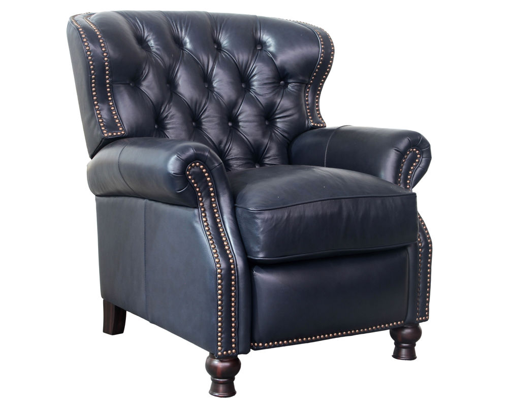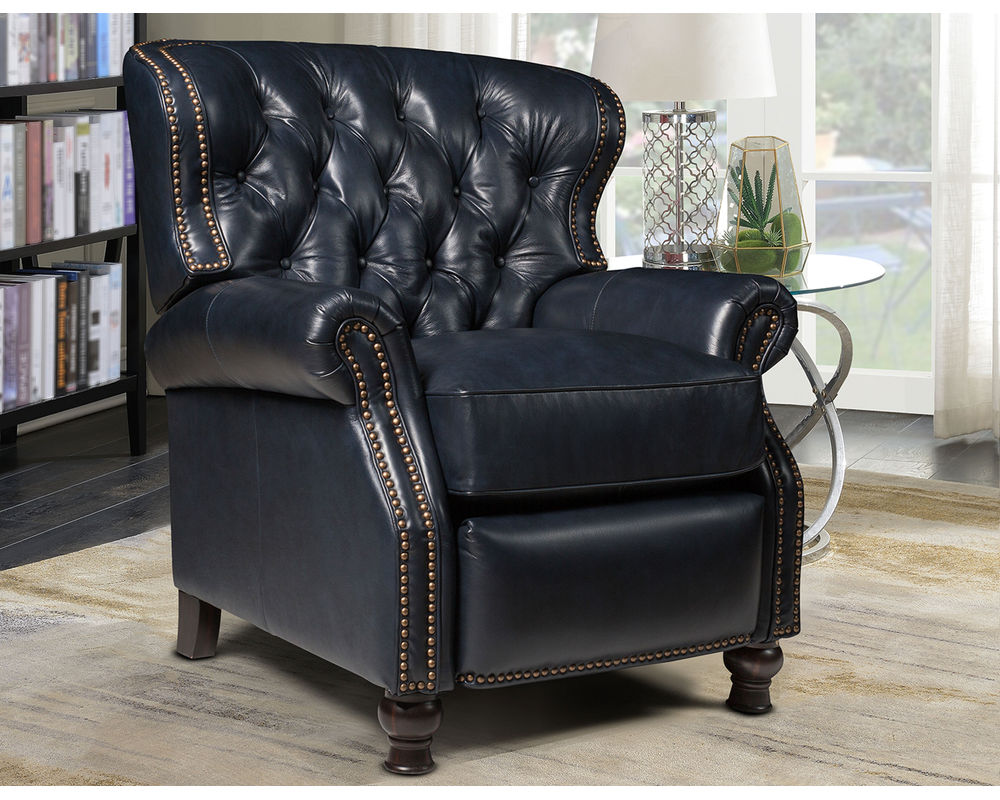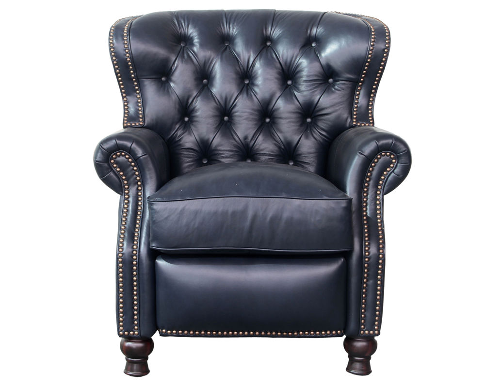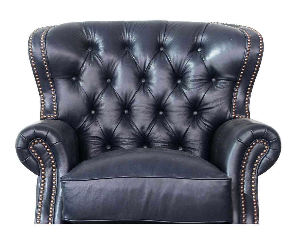 Introducing the Presidential Leather Recliner - the epitome of traditional classic elegance and timeless styling. This exquisite piece of furniture, with its deep button tufting, barrel back, and accenting nail head trim, exudes luxury and is designed to provide comfort and beauty to your home. The Presidential will become the focal point of any room, adding a touch of opulence to your living space.