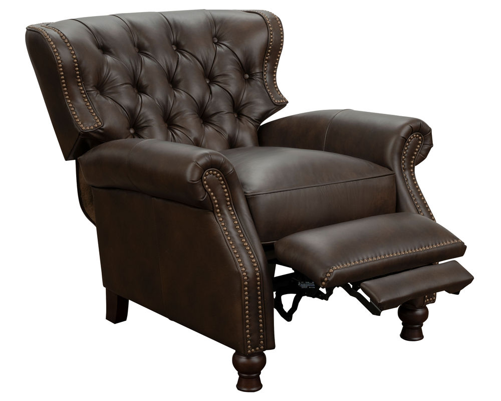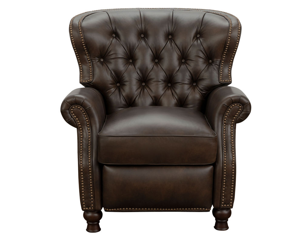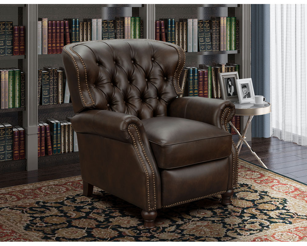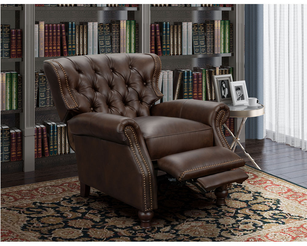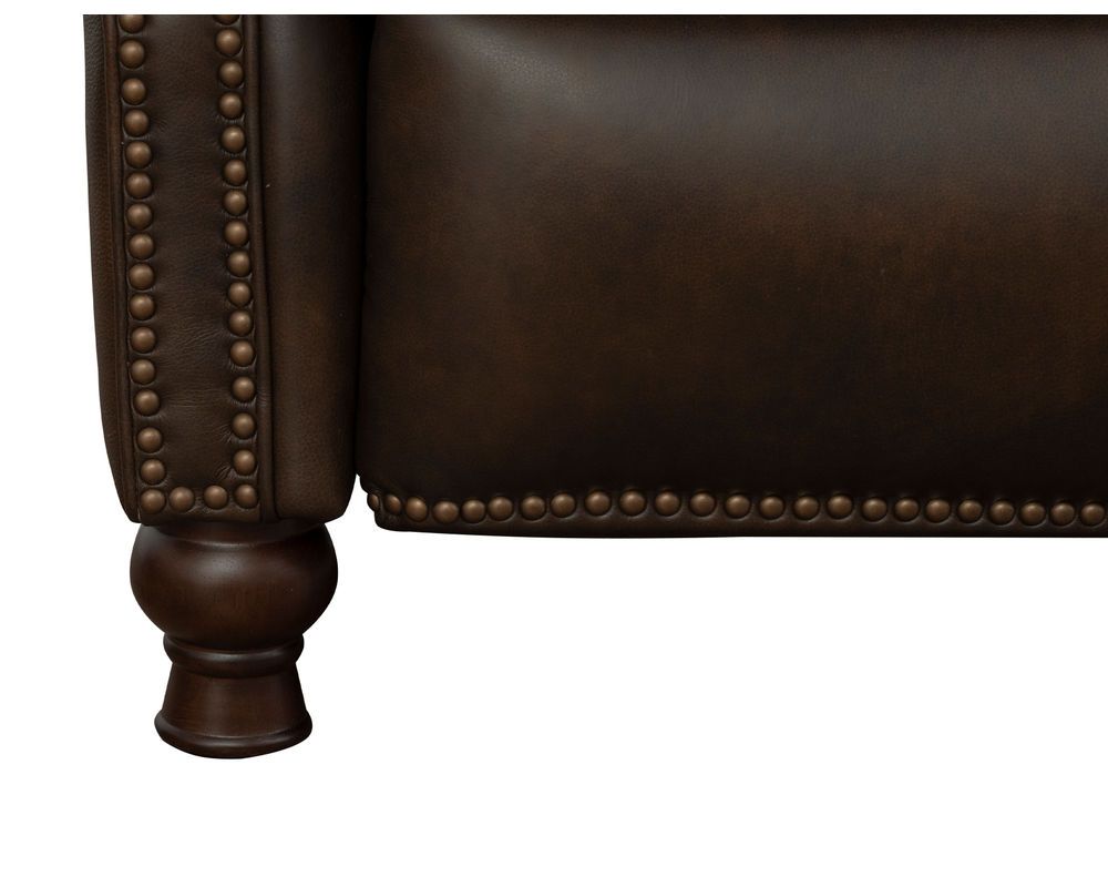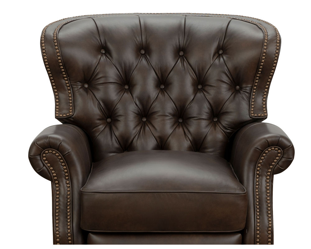 Introducing the Presidential Leather Recliner - the epitome of traditional classic elegance and timeless styling. This exquisite piece of furniture, with its deep button tufting, barrel back, and accenting nail head trim, exudes luxury and is designed to provide comfort and beauty to your home. The Presidential will become the focal point of any room, adding a touch of opulence to your living space.