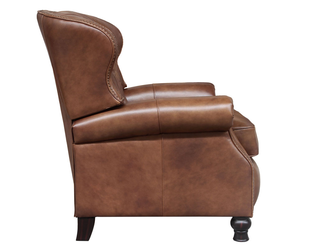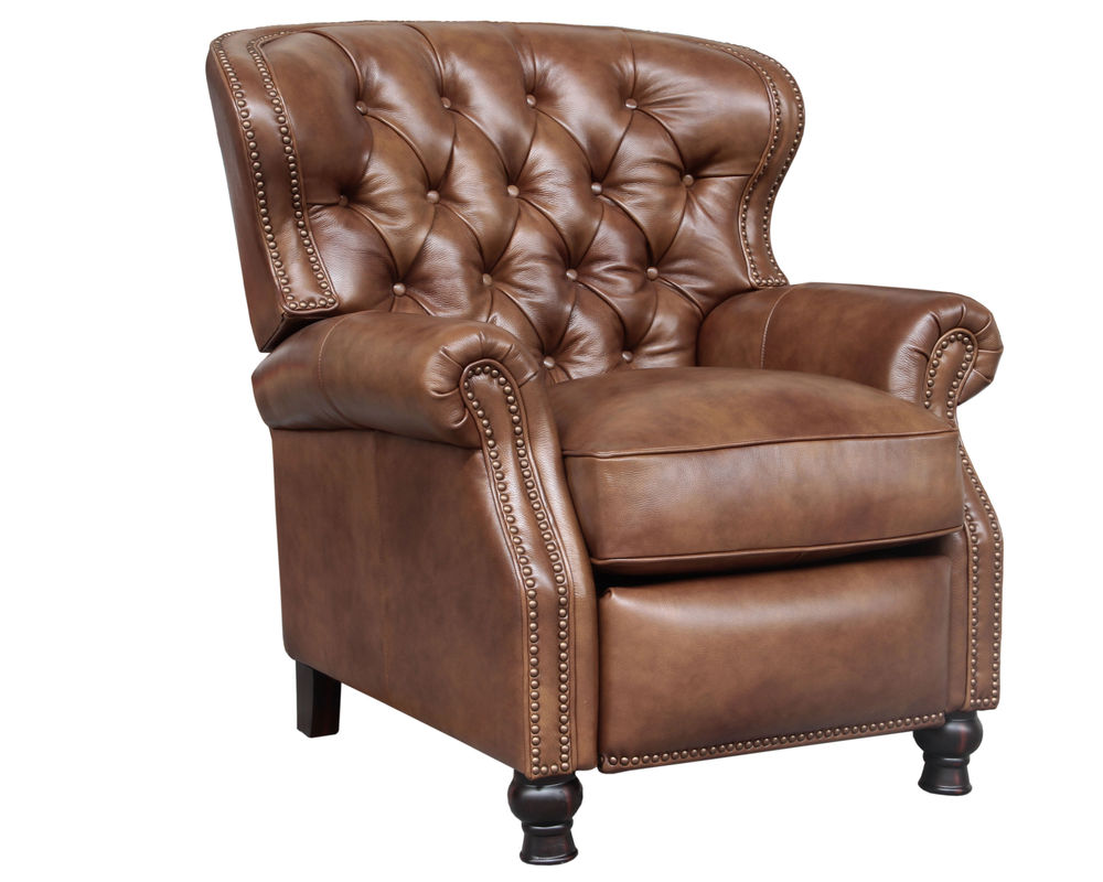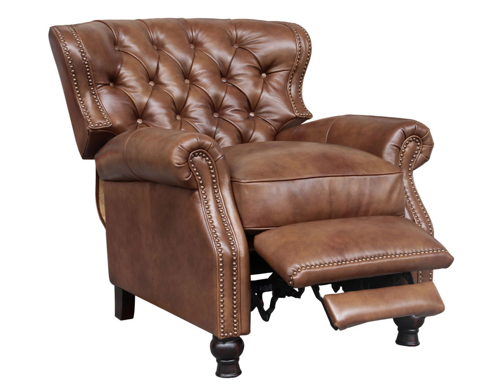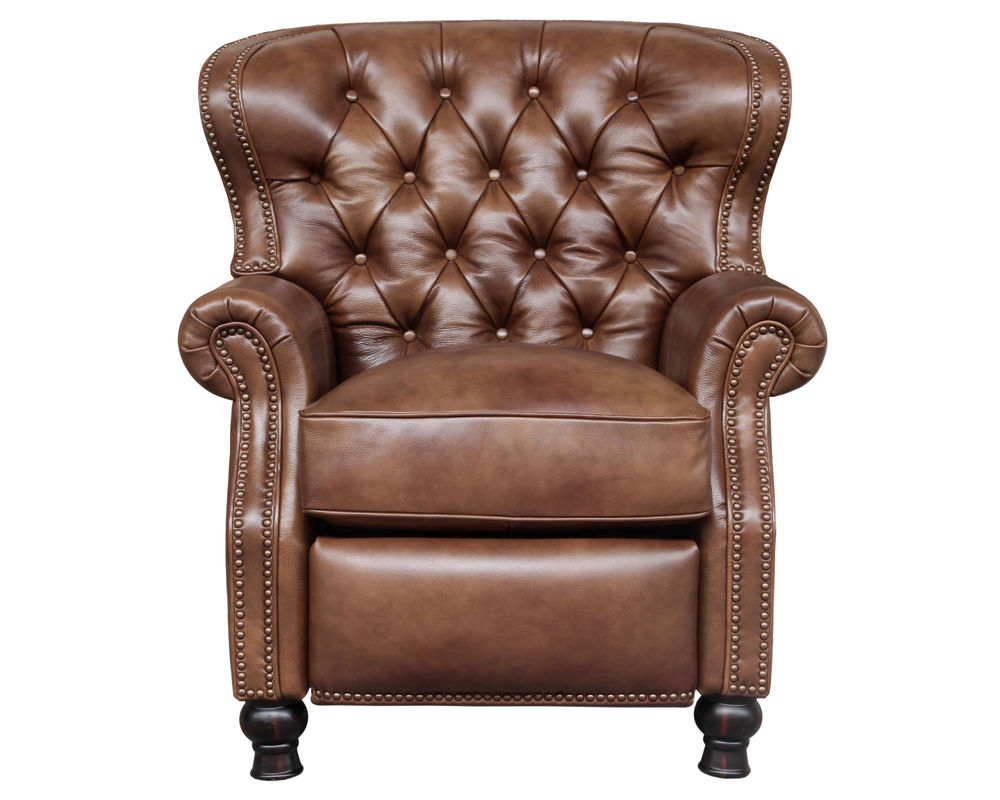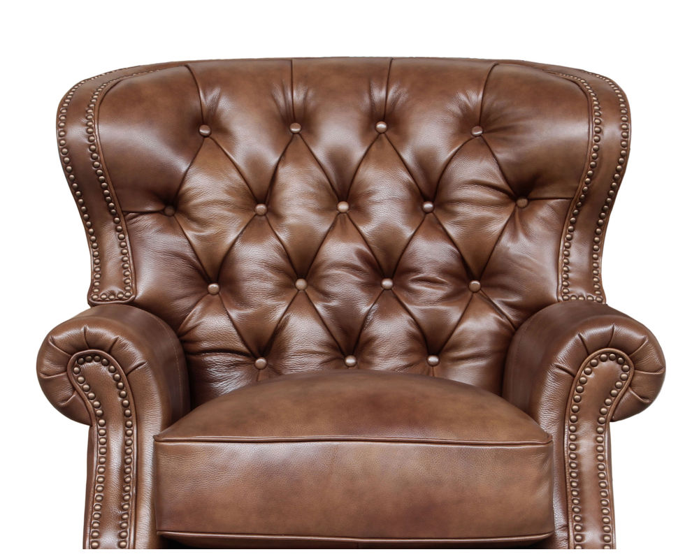 Introducing the Presidential Leather Recliner - the epitome of traditional classic elegance and timeless styling. This exquisite piece of furniture, with its deep button tufting, barrel back, and accenting nail head trim, exudes luxury and is designed to provide comfort and beauty to your home. The Presidential will become the focal point of any room, adding a touch of opulence to your living space.