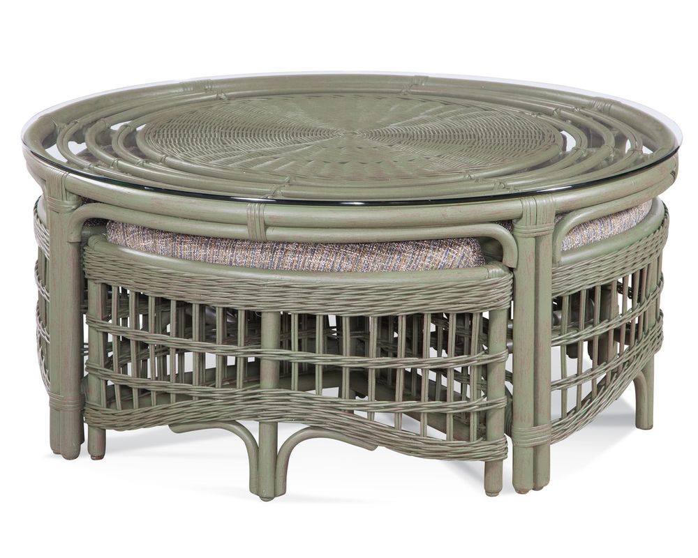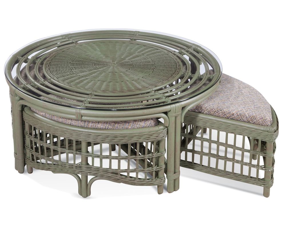 The Raffles Cocktail Table blends coastal style, versatility, and function in one stunning centerpiece. Featuring a beautifully woven rattan base with a round glass top, this cocktail table is paired with four upholstered benches that slide neatly underneath for easy storage. Perfect for entertaining or everyday living, it offers both style and convenience. Handcrafted in the USA, and available in a wide variety of customizable fabrics and finishes, the Raffles adds both charm and practicality to your living space.