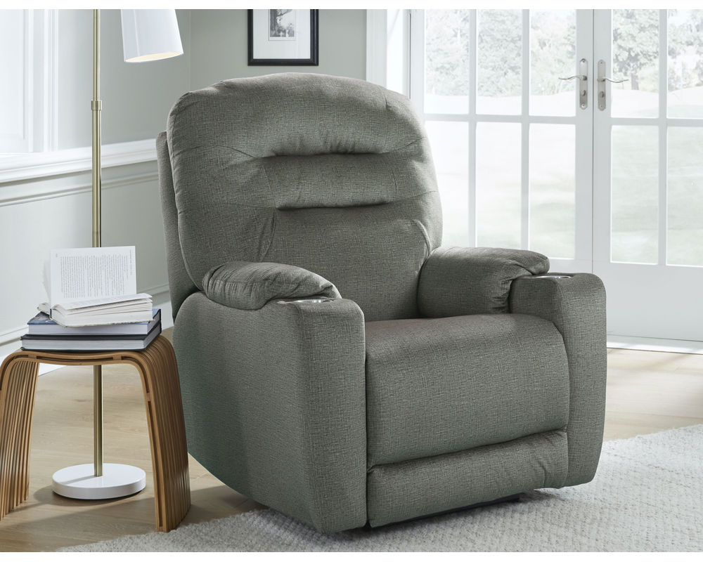 The Front Row Recliner, the perfect combination of comfort and convenience. This recliner features two stainless steel cupholders in the arms so you can enjoy your favorite beverages. Its smart casual style is perfect for any room setting. Its plush, pleated back and gently radiused arms provide maximum comfort and support. Pad-over-chaise seating ensures full-body support.