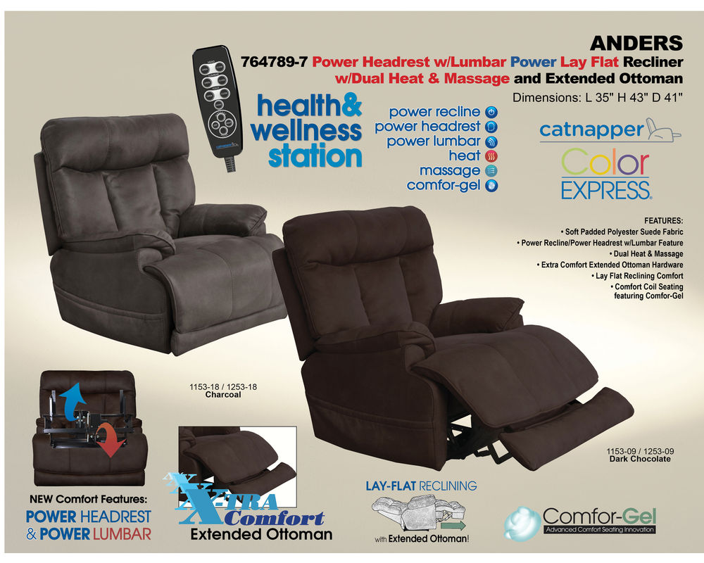 Not much more you can say about the Anders recliners. Includes power adjustable headrest, power adjustable lumbar, power lay flay recliner with Dual Heat and Massage and an Extended Ottoman just for a little more comfort. Quality built recliner with steel seat box that features Comfort Coil seat cushions with infused Comfor cooling gel.