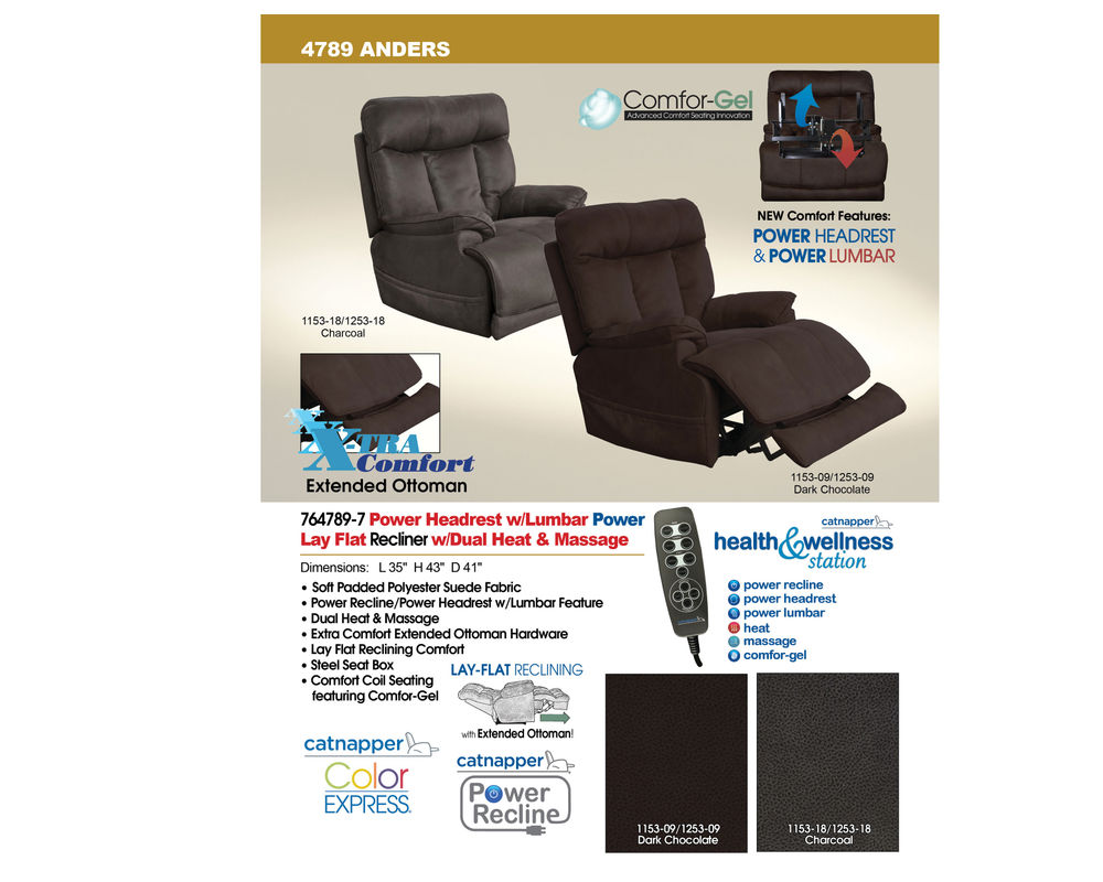 Anders Power Headrest – Power Lumbar Lay-Flat Power Recliner w/Dual Heat & Massage and Extended Ottoman (Choice of Colors)