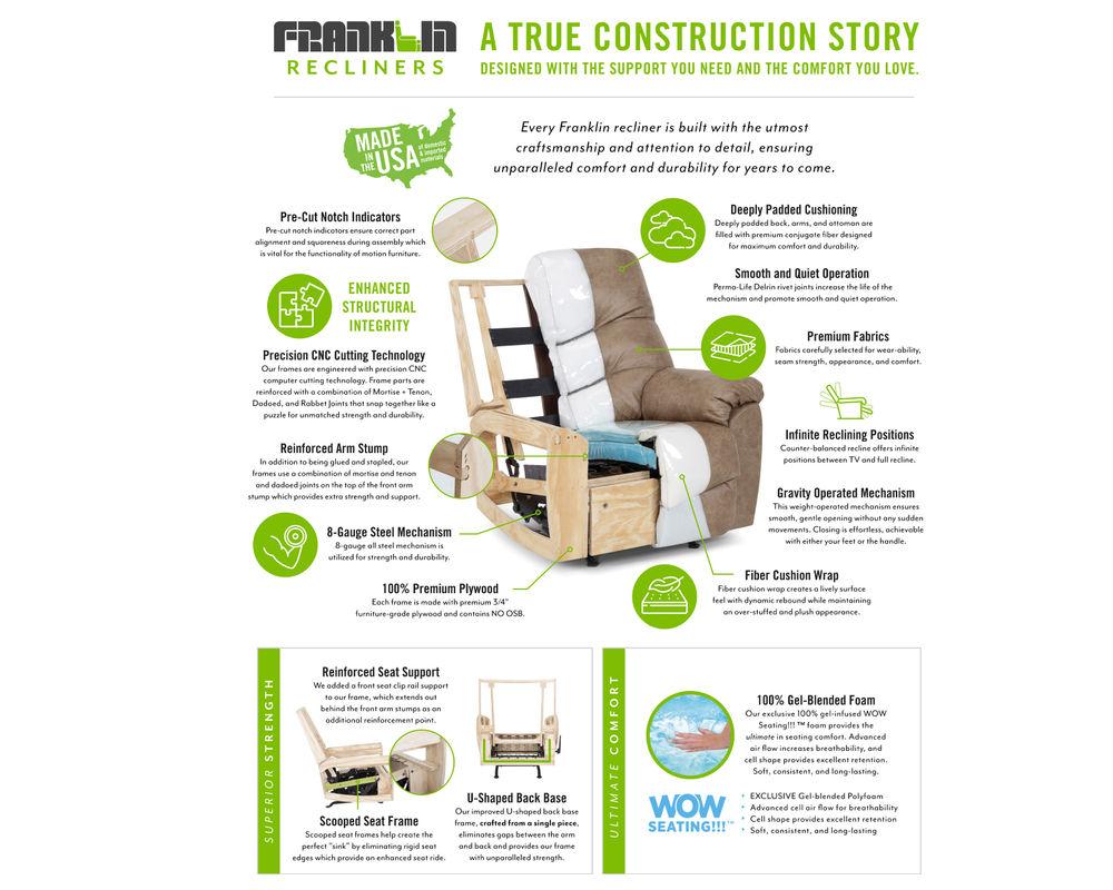 At Franklin we are passionate about our product. Quality is not just a word to us, but an obsession. We fabricate our own foam, stamp our own reclining mechanisms, and cut our own wooden frames. We stand behind our product and that is why we are able to offer you the best warranty in the industry.