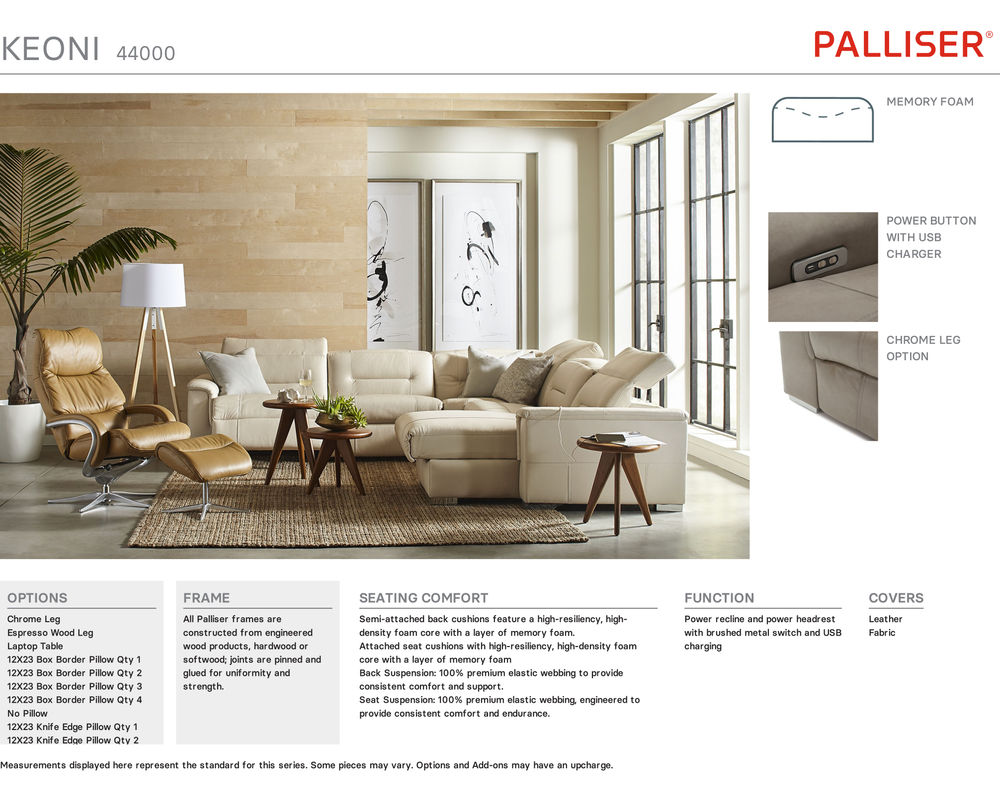 The Keoni’s suspension system—made of 100% premium elastic webbing—provides consistent comfort, while Palliser’s durable, precision-crafted frames ensure structural integrity for years to come. With its perfect blend of bold style, ergonomic luxury, and wall-hugger efficiency, the Keoni is an ideal choice for contemporary living spaces of any size.