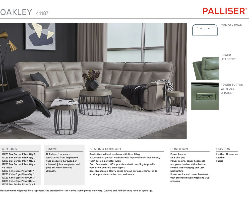 The Oakley 41187 Wallhugger Recliner also features a double-bolstered back for a structured look, accented by topstitch details on the back and seat. The power headrest and recliner allow for infinite positioning, ensuring you find your perfect comfort level. And with wall-hugger technology, you can fully recline with as little as 2" of wall clearance.