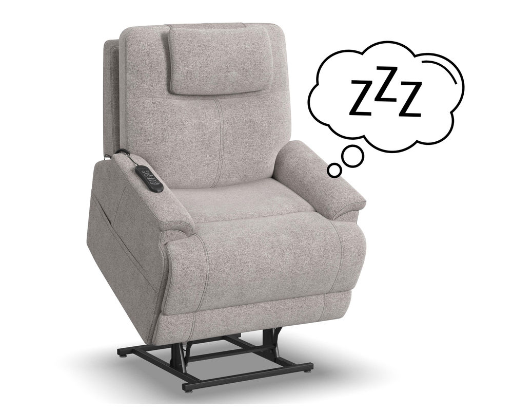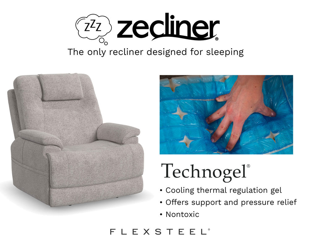 Cozy up in the Zecliner Model 2 Power Lift Sleep Chair, your perfect family recliner by day, and haven for peaceful sleep by night. The zoned memory foam comfort areas in the backrest, seat, and shoulders, removable cooling head pillow, padded arms, and waterfall chaise provide a level of comfort that will make you feel truly at ease. The hand-wand control lets you customize your comfort. Zero Gravity puts you in a state of weightlessness, and Power Lift assists when standing. This recliner is armed with reliable performance fabric upholstery that repels stains and spills, while being easy to clean. With Flexsteel’s patented Blue Steel Spring™ at its core, this recliner has surrounding comfort for relaxation and slumber. Achieve blissful relaxation by day and a rejuvenating sleep by night with the Zecliner.
