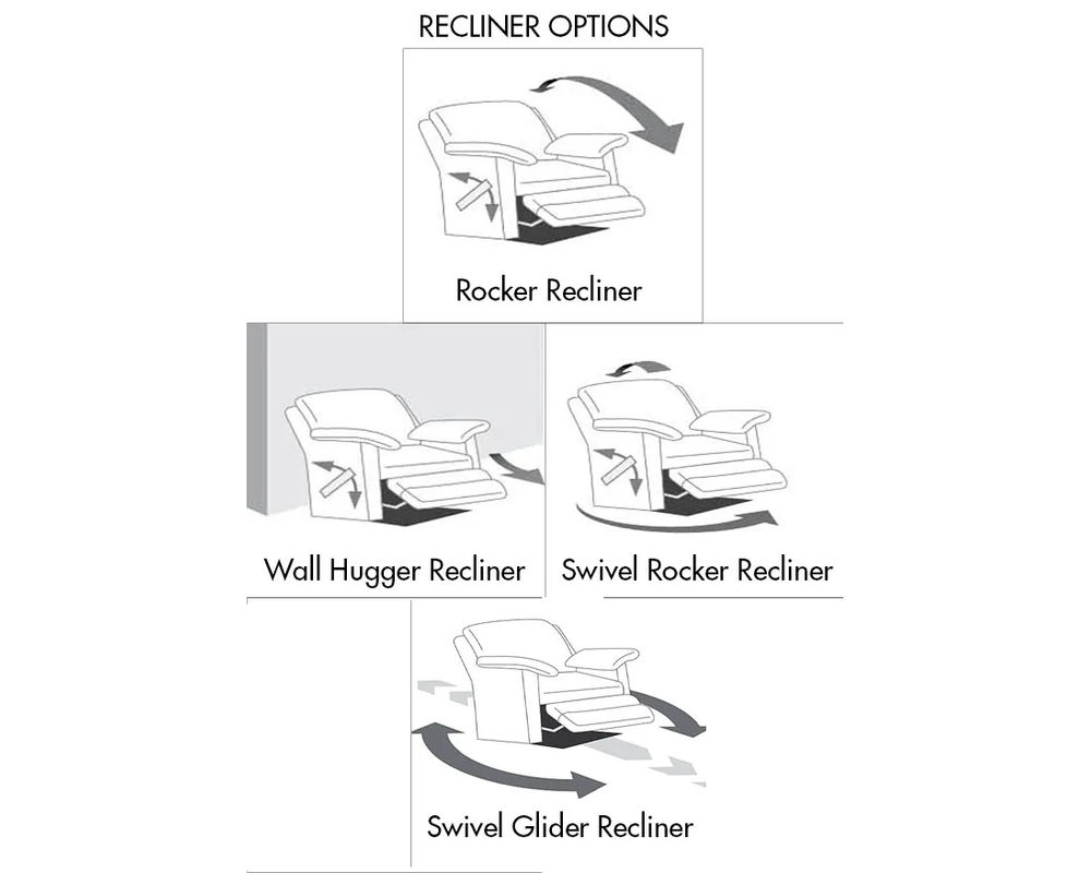 • Four reclining mechanisms: Rocker Recliner, Wallhugger Recline, Swivel Rocker Recliner, and Swivel Glider Recliner