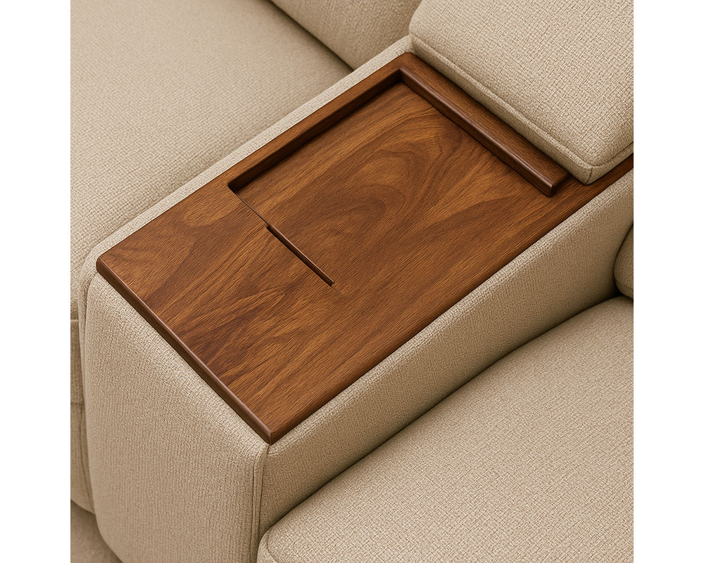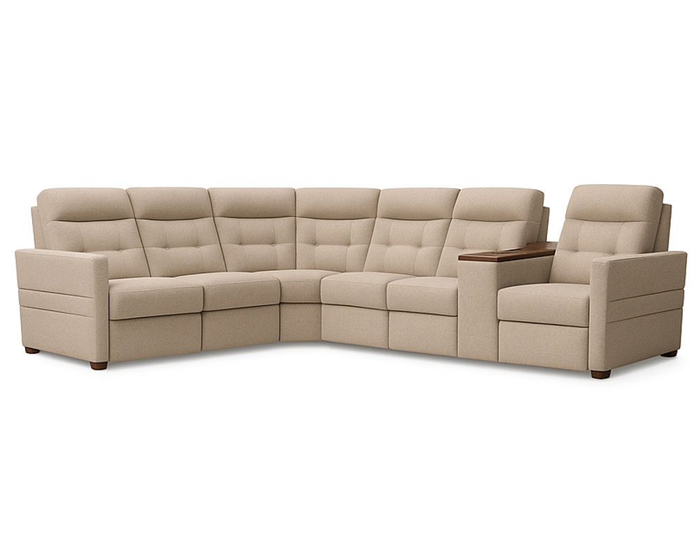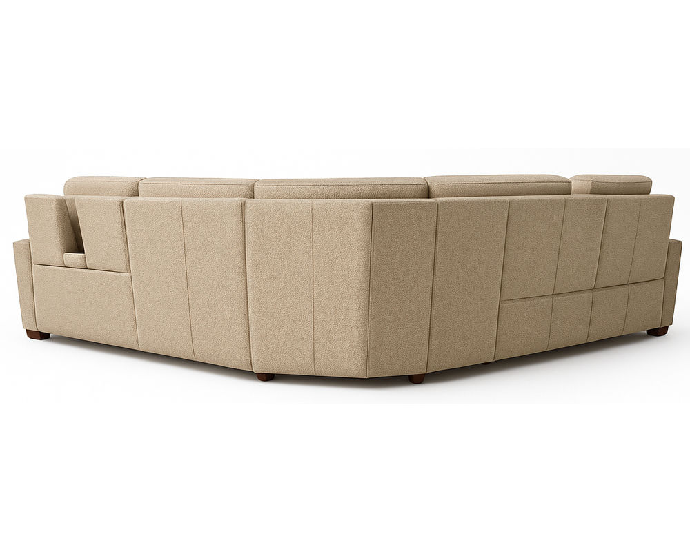 The design of the Reece is a testament to elegance and sophistication. It begins with a transitional narrow track arm, heavily padded for added comfort, both on the inside and outside panels. The outside arm panels feature two horizontal channels, elevating the look even further. The seat and backs of the sectional also mirror the track arm, with box border styling for a sleek and modern look. The backs even include a decorative pull-tuck detail, adding a touch of elegance to the design.