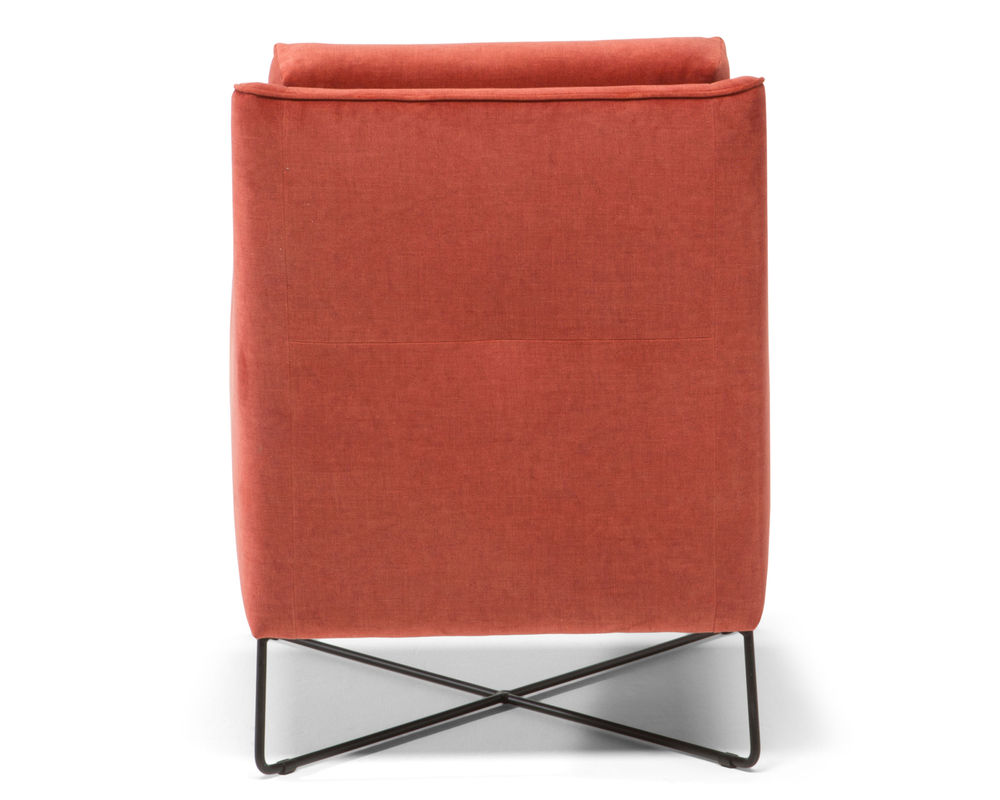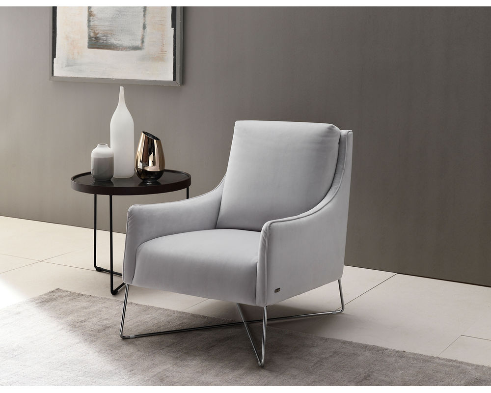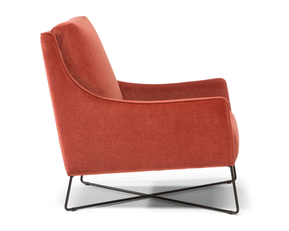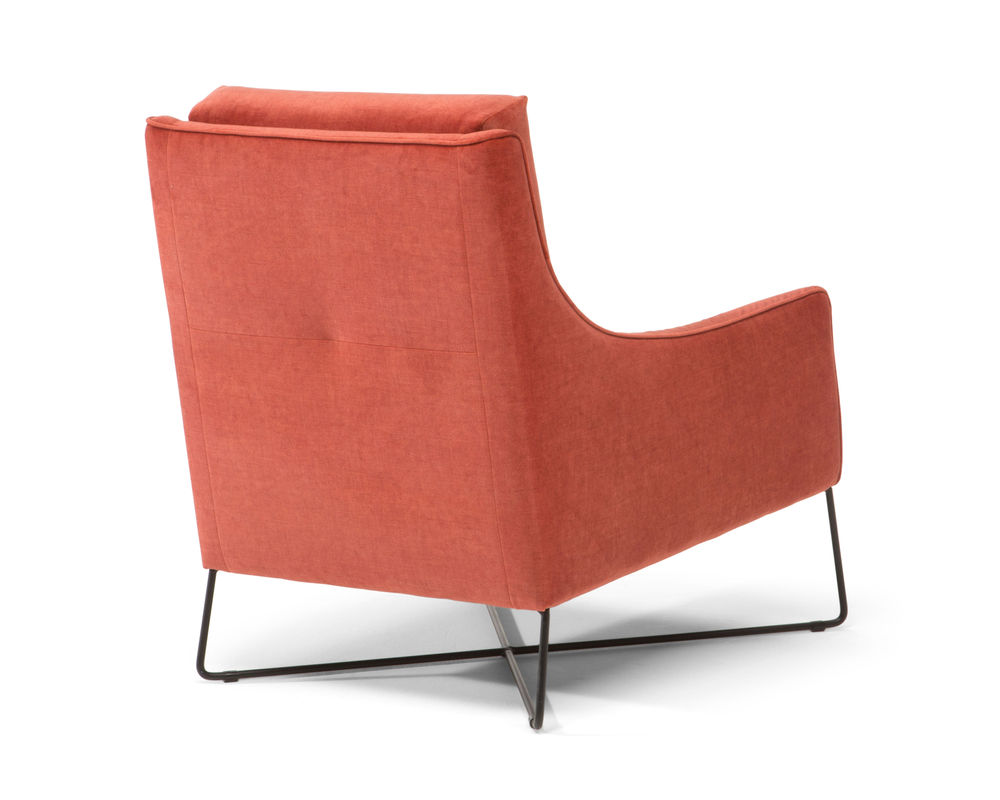 A modern interpretation of an otherwise retro-style creation, the Regina B903 Arm Chair makes for the perfect accent chair in any contemporary or transitionally styled space. This armchair is covered in a choice of over 40 durable fabrics. Lauded for its suppleness and softness, top-grain leather is ultra-luxurious and can add warmth and sophistication to any living space. It ages naturally with time to reveal a handsome patina and utter softness that cannot be beaten. The Regina B903 Arm Chair features a slant-style silhouette with a bold yet simplistic appearance. This chair has slim track arms extending down from the top of the back, offering it its unique shape. This armchair sits atop metallic, tapering legs that further its modern appearance.