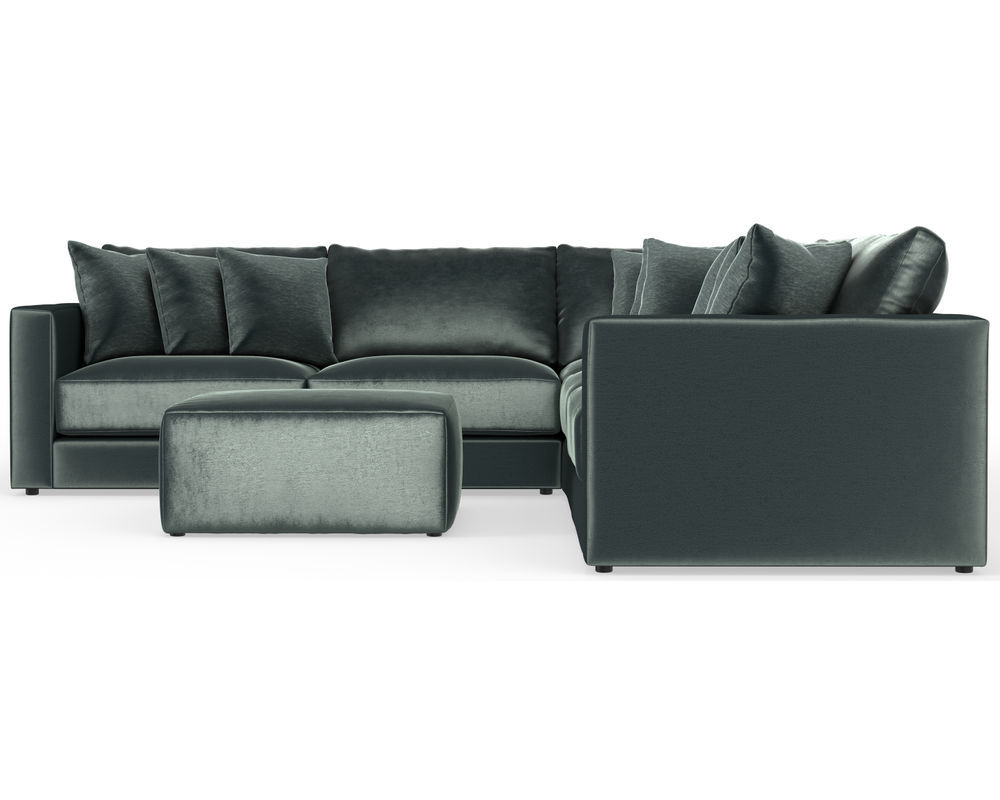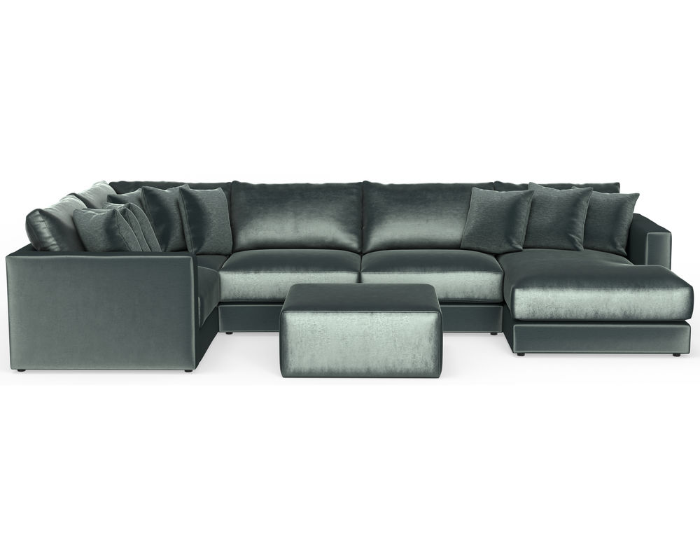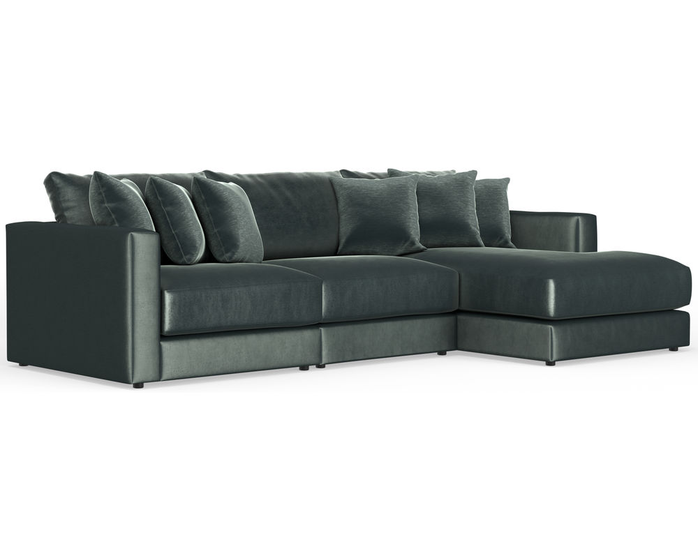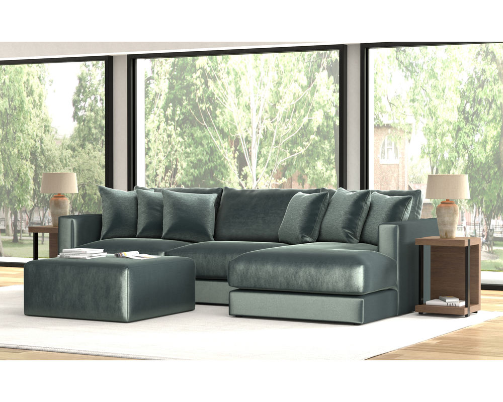 The Remington Sectional, with its deep seat, provides ample space for you and your loved ones to lounge on. The loose back cushions allow for easy adjustment, making it versatile and adaptable to your comfort needs. The luxurious velvet fabric gives the sectional a lavish touch, making it a statement piece in any living room or entertainment area.
