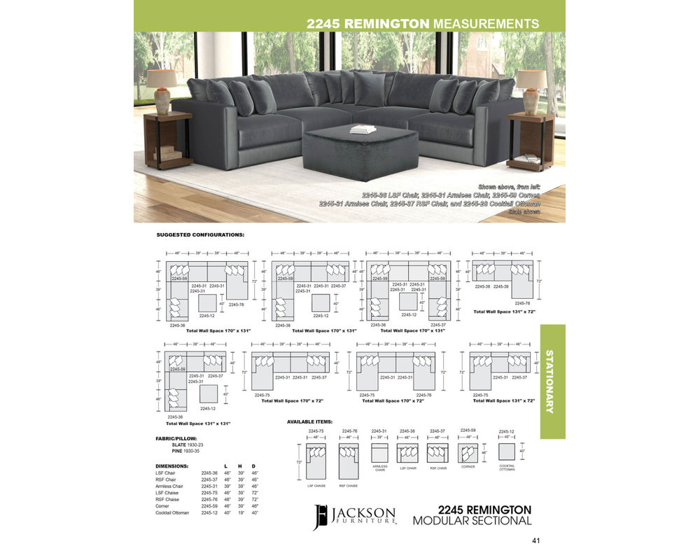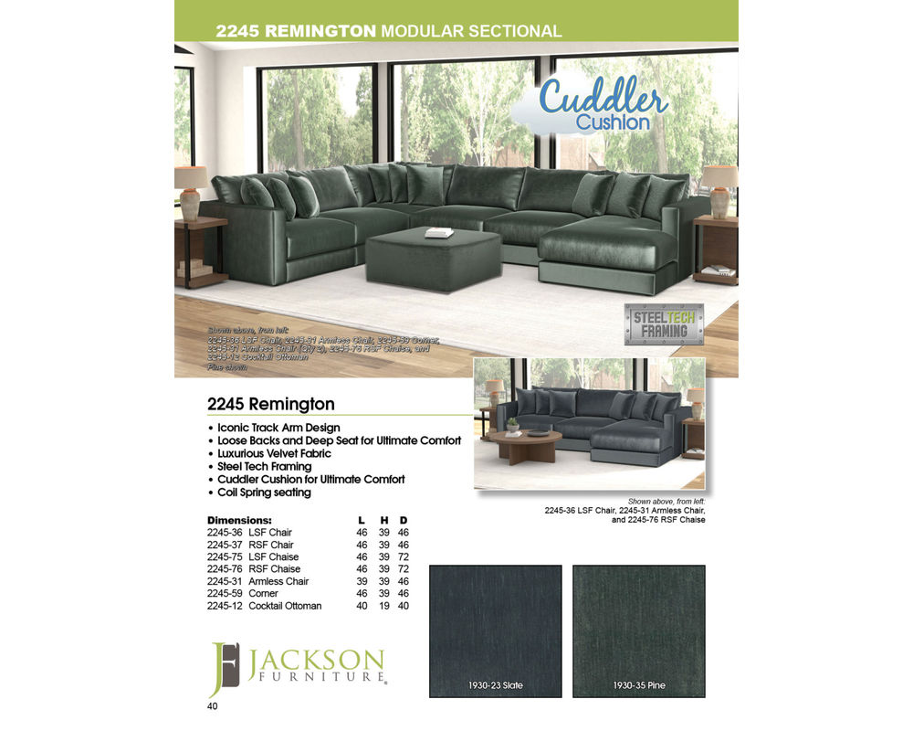 Introducing the ultimate in comfort and style, the Remington 2245 Sectional. This elegant sectional, with its track arm design and loose back cushions, creates a modern and sophisticated look that will elevate the style of any living room. The Cuddler Cushion adds extra coziness, making this sectional the perfect spot to relax and unwind after a long day.
