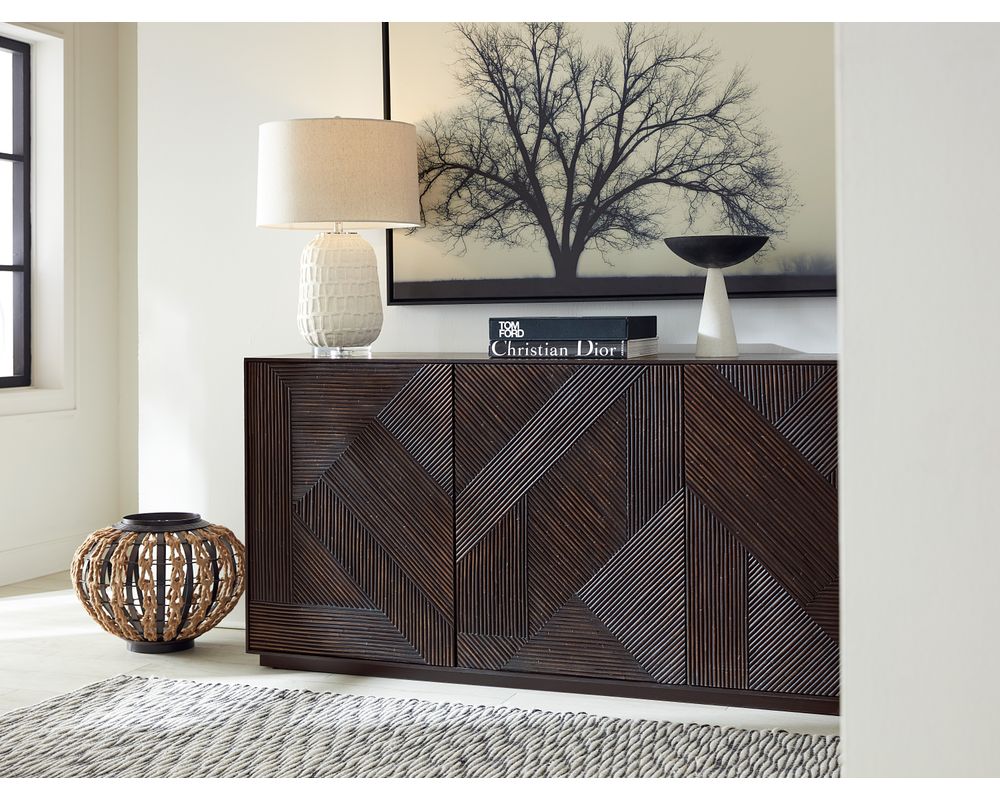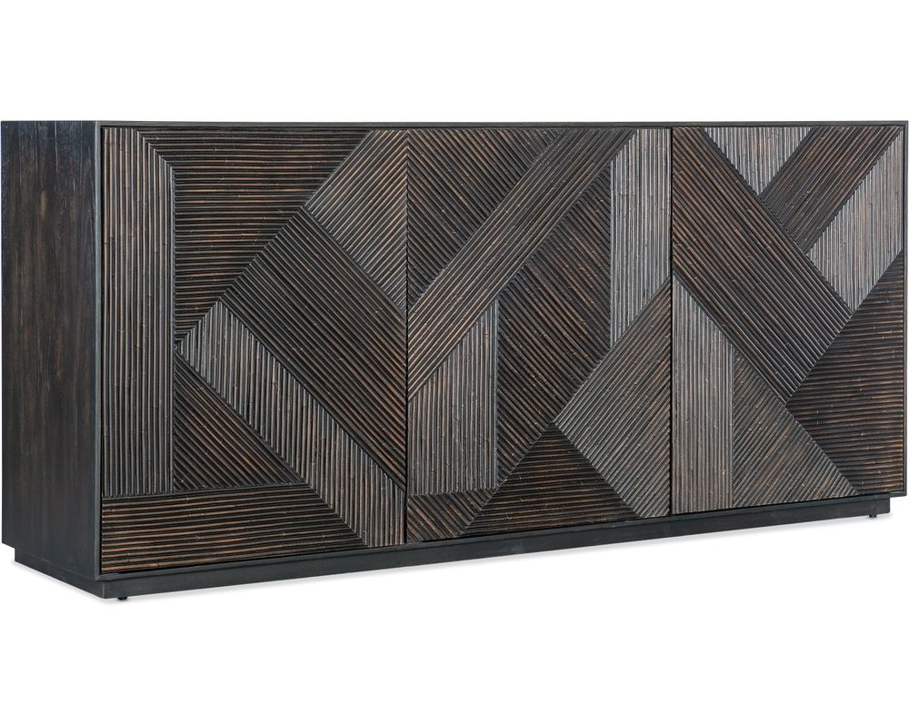 From Sofas and Sectionals.com: Introducing the Retreat Entertainment Credenza – a stunning piece of furniture that will transform your living room into a tranquil and modern oasis. Tropical retreats inspire this beautiful credenza and feature a striking carved wave motif on its door fronts, adding a touch of elegance to any space.